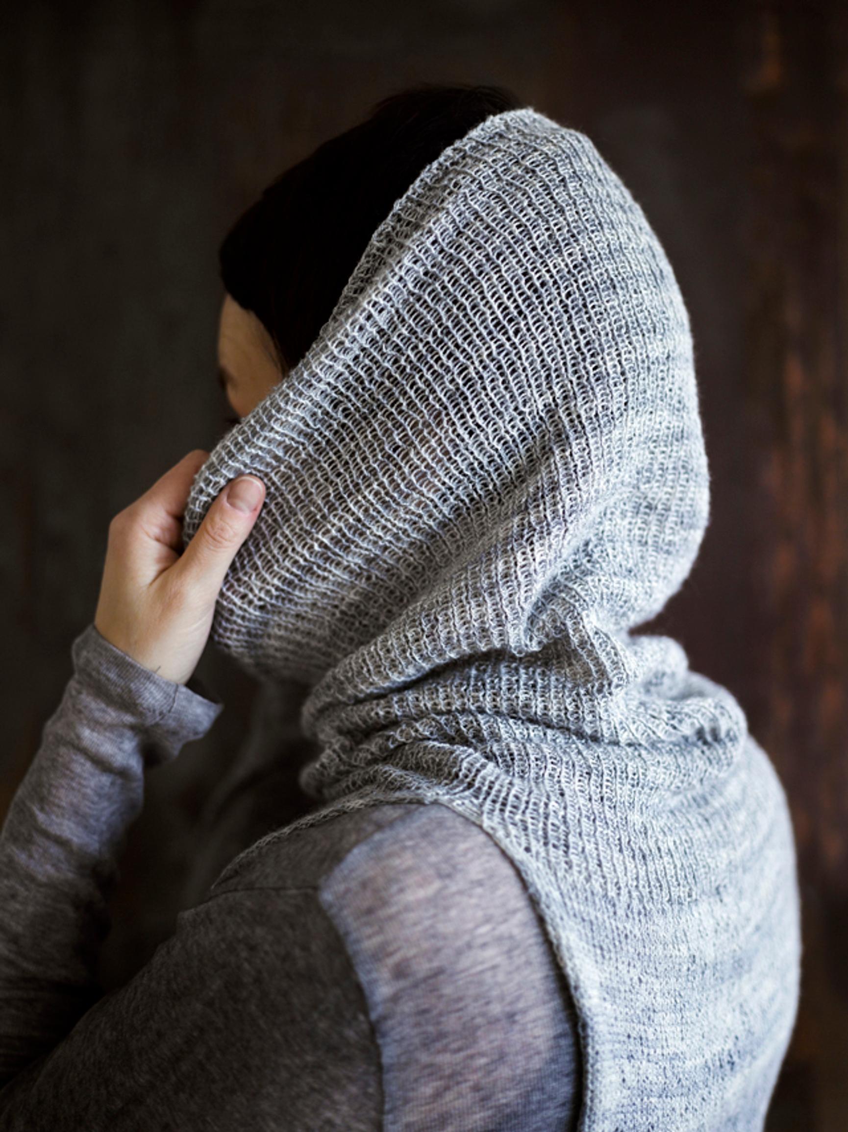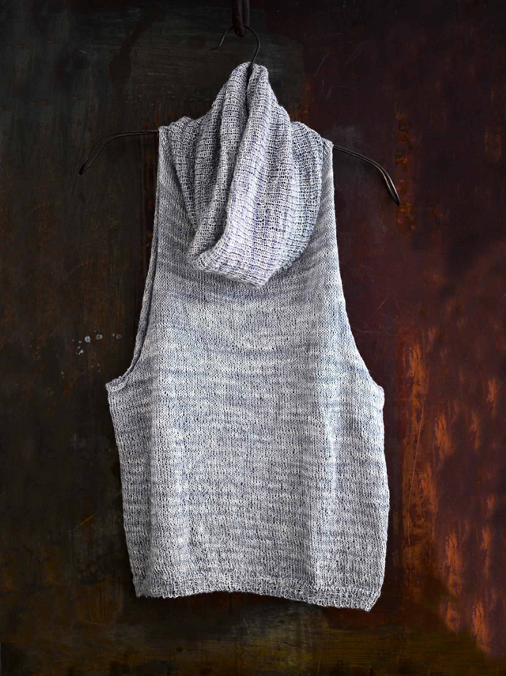 Eleettömän kauniin silkkiliivin kaulus muuntuu tarvittaessa hupuksi. Neulottu liivi syntyy helposti yhdestä lankakerästä.