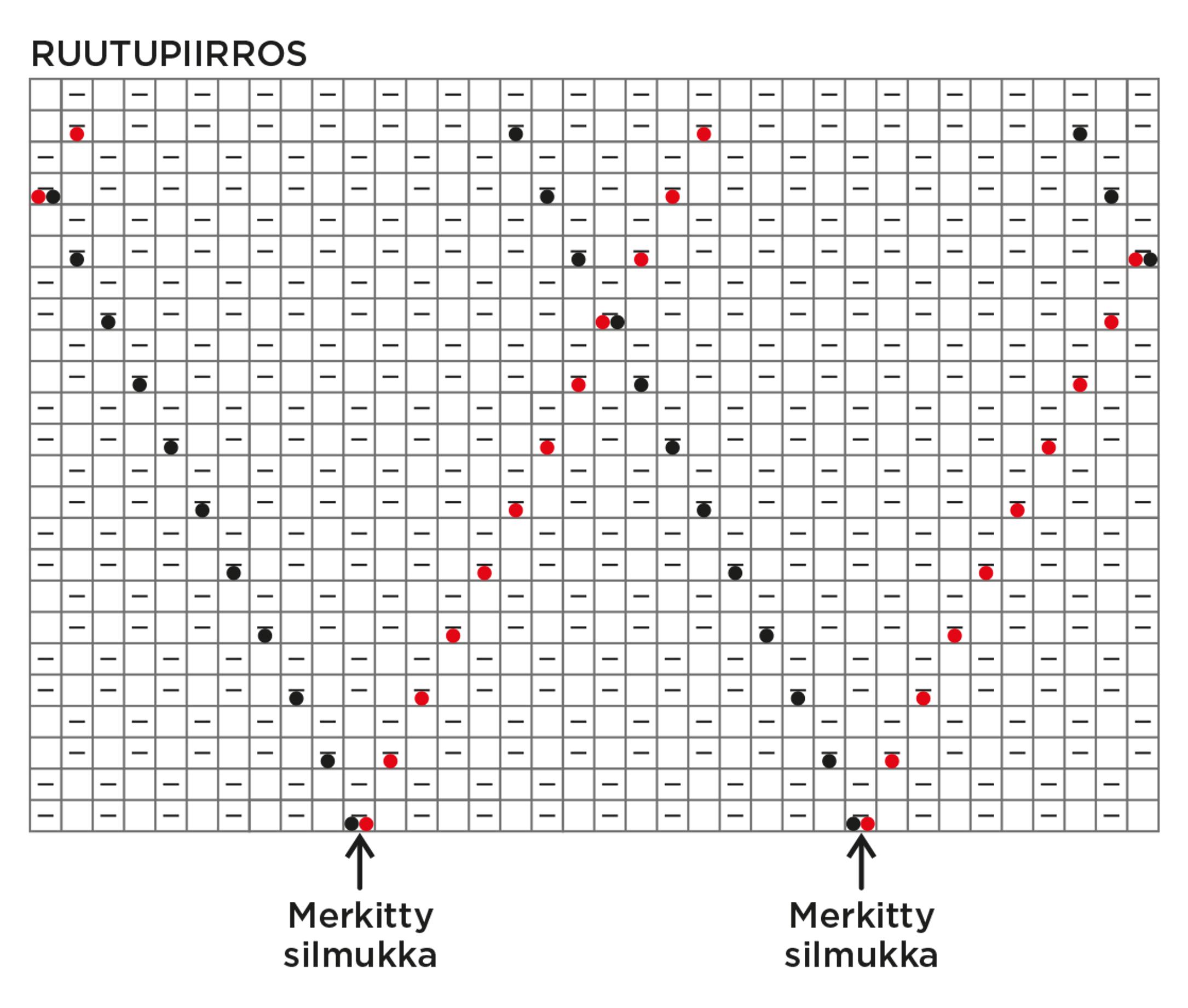 Merkitse ensin ketjuja varten torkkupeiton alareunaan oikeasta reunasta alkaen 10., 26., 42. silmukka jne. Eli alareunaan tulee ensimmäisen merkityn silmukan jälkeen aina merkki joka 16. s:aan.