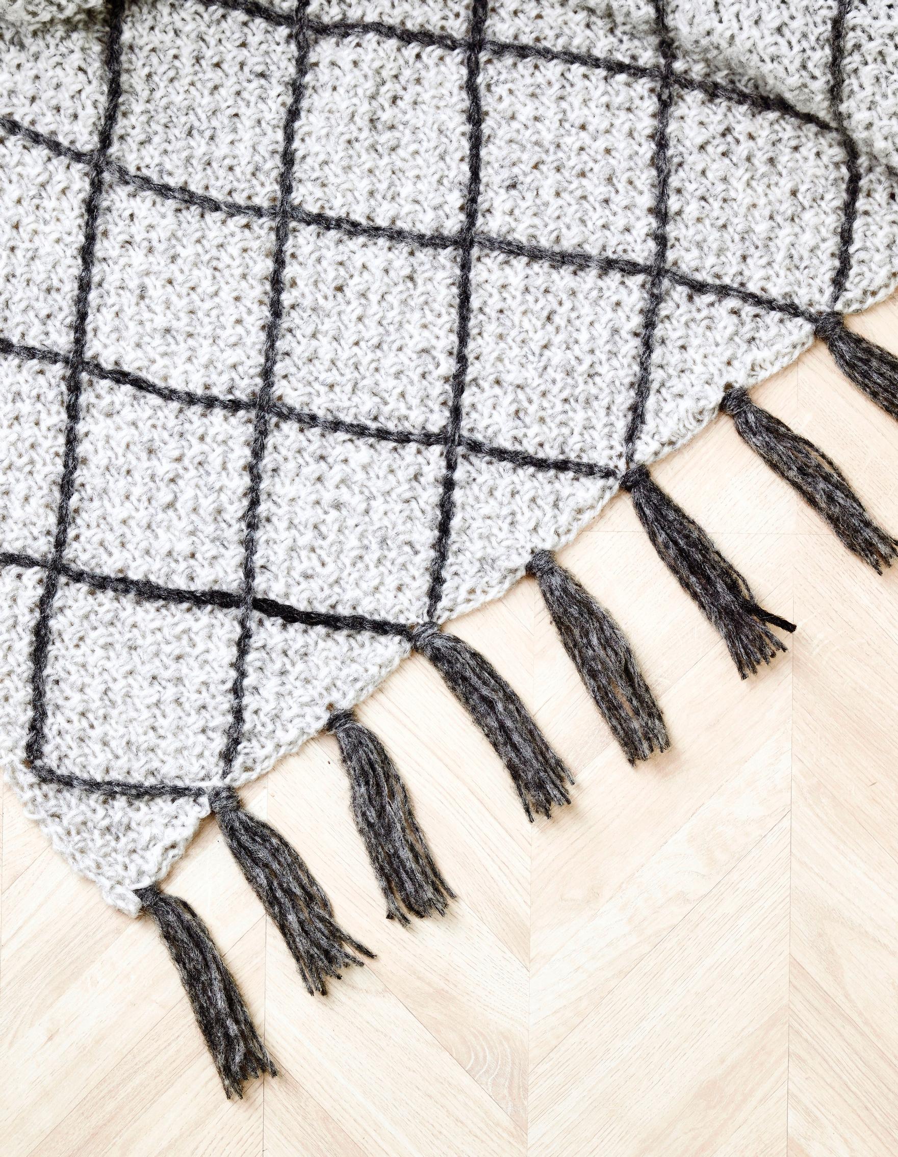 Neulottu peitto lämmittää ihanasti kylmien kuukausien aikana. Lumen ja kallion sävyisillä langoilla peittoon tulee talven tuntu. Peitto neulotaan pidennetyllä helmineuleella, ruutukuvio syntyy jälkikäteen virkkaamalla.