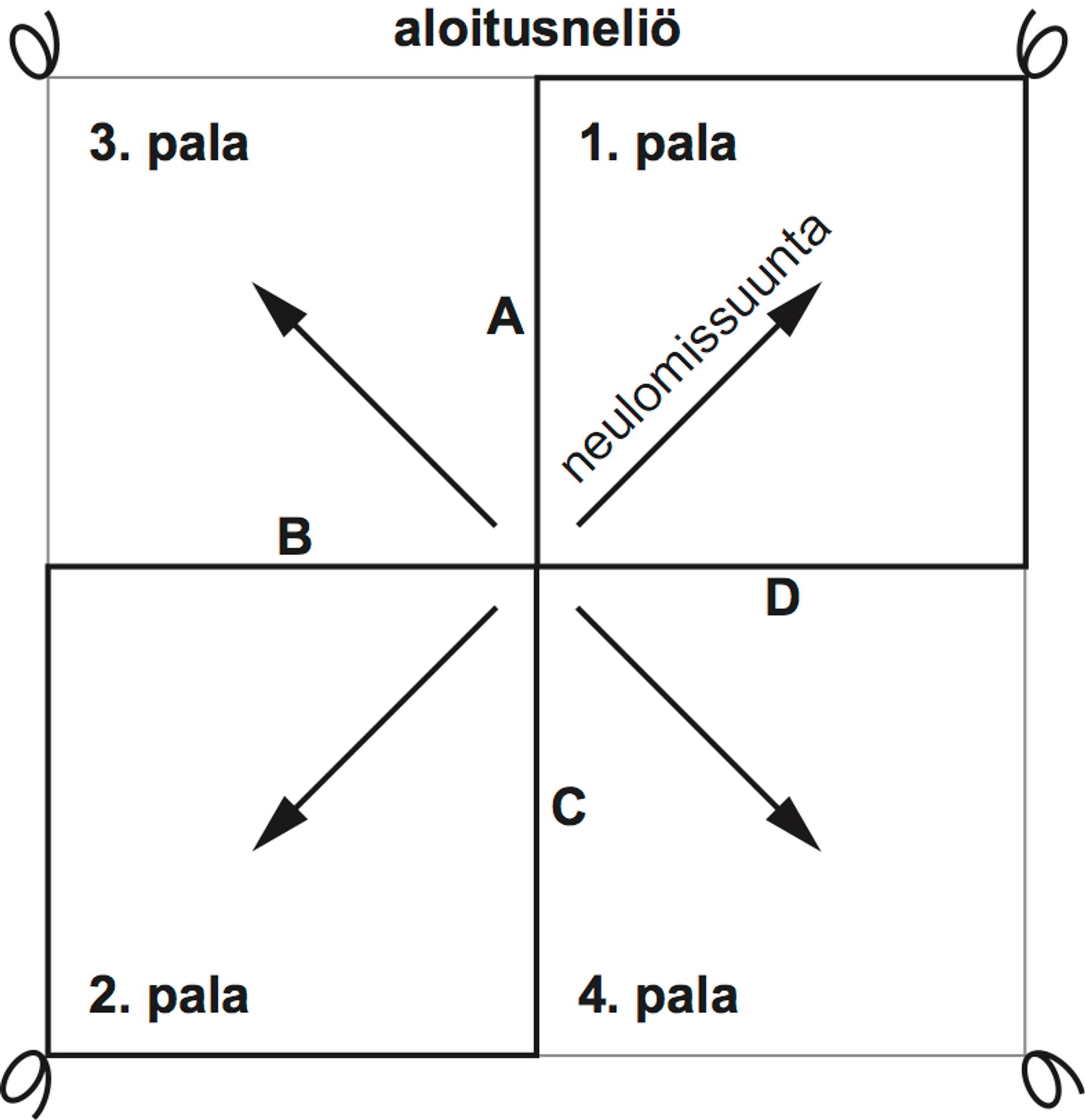 Neulo aloitusneliön jatkoksi 4 uutta palaa näin: poimi puikolla olevan kärkis:n jatkoksi palan vasemmasta sivusta 25 s, sitten koukun avulla 1 kulmasilmukka kahden palan rajakohdasta, puikolla viereisen palan sivusta 25 s ja lopuksi vielä koukulla 1 s kärkisilmukkaa alemmasta kerroksesta (= vie koukku kärkis:n alla olevasta s:sta työn np:lle, vedä kude läpi ja nosta puikolle) = 53 s. Neulo pala kuten edellä, lyhennä kude n. 15 cm:n mittaiseksi ja vedä se löyhästi kärkis:n läpi.