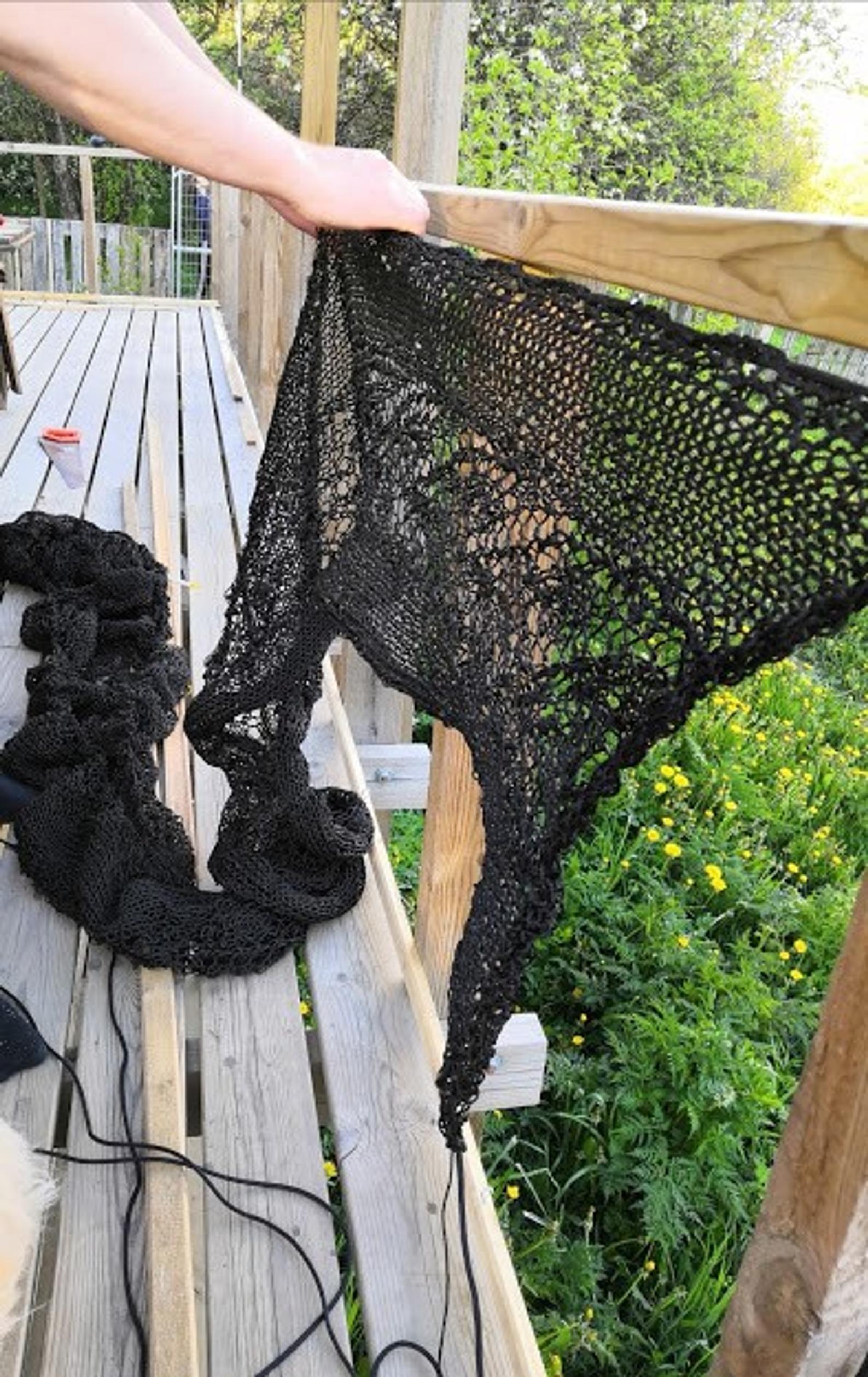 Neulontakokemuksen myötä Helillä riitti taitoa suunnitella itse terassille sopiva kaide kuvioineen ja mittoineen. Langaksi valikoitui Tokmannilta löytynyt Masterin musta, 2 mm paksuinen koukkulanka, jota kului 4,5 kiekkoa.
