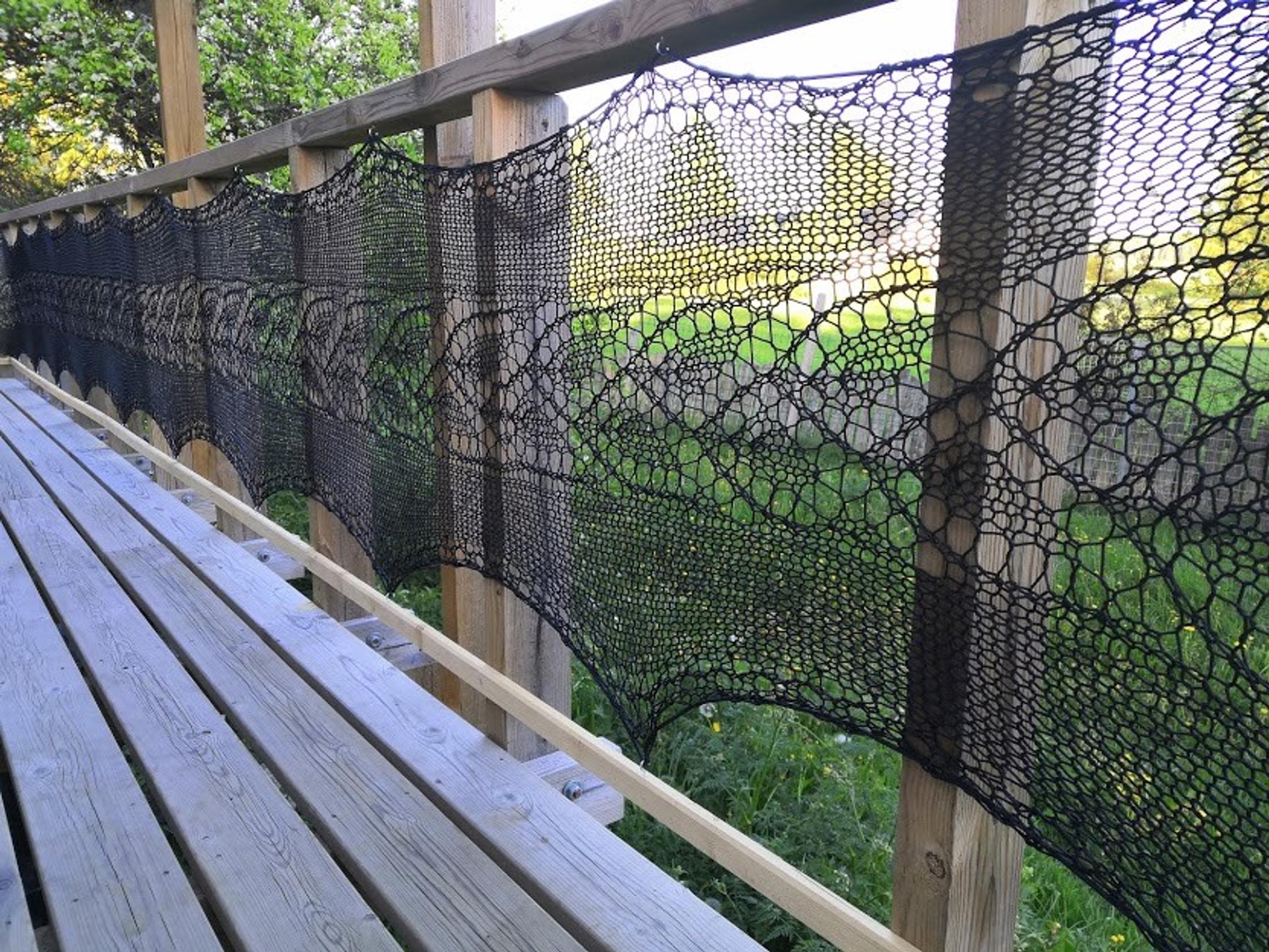– Neulottua kaidetta on yhteensä yhdeksän metriä. Neuleen ylä- ja alareunaan on pujotettu paksumpi nyöri, josta verkko on pingotettu koukuilla terassin puurakenteisiin. Puiset kaiteet ovat todella tukevat, neuleverkko on siis lähinnä koristekaiteena.