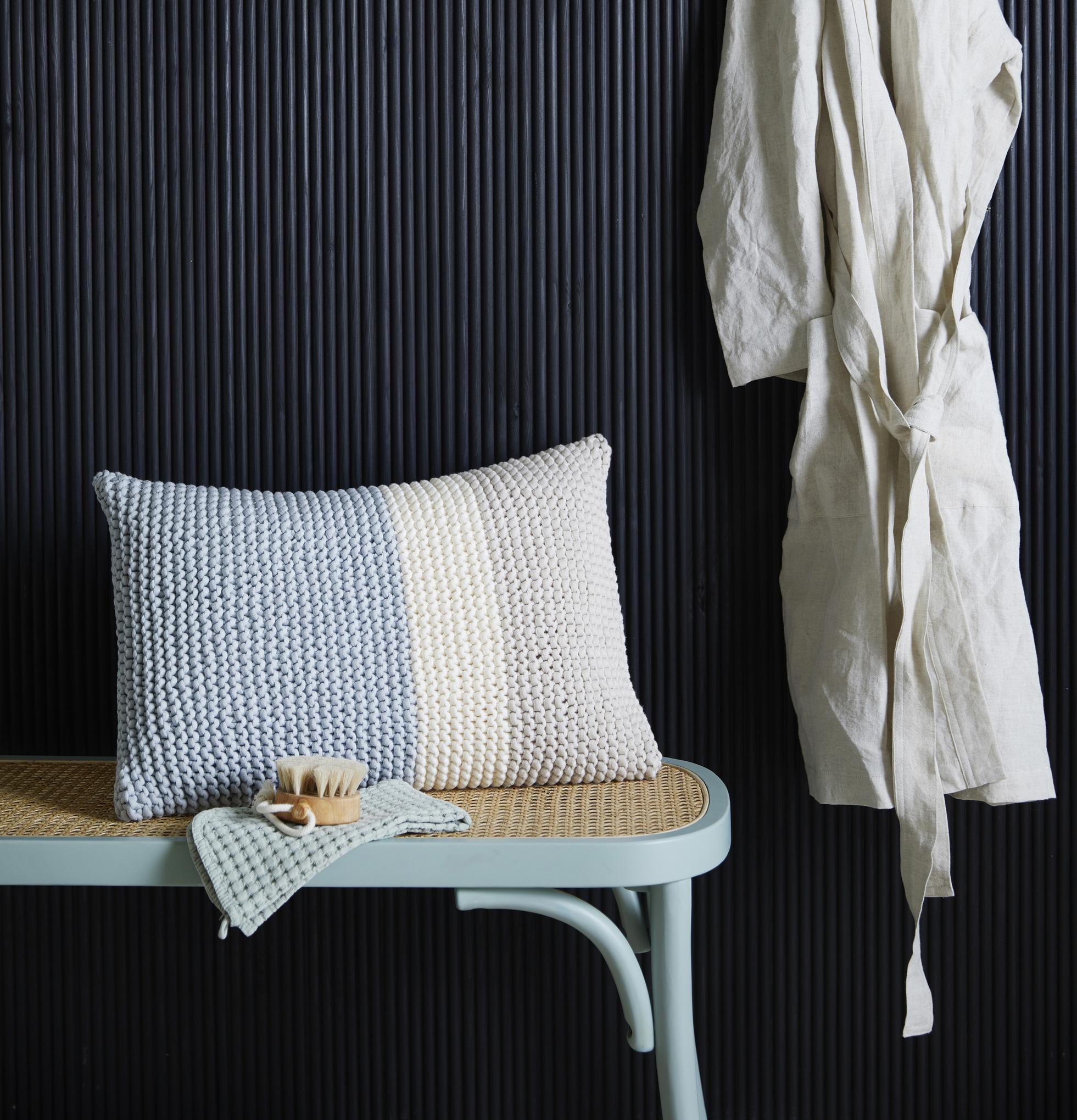 Neulottu tyyny valmistuu nopeasti, sillä sen materiaali on muhkeaa trikookudelankaa. Raidallinen tyyny sopii niin kotisohvalle, mökille kuin terassille.