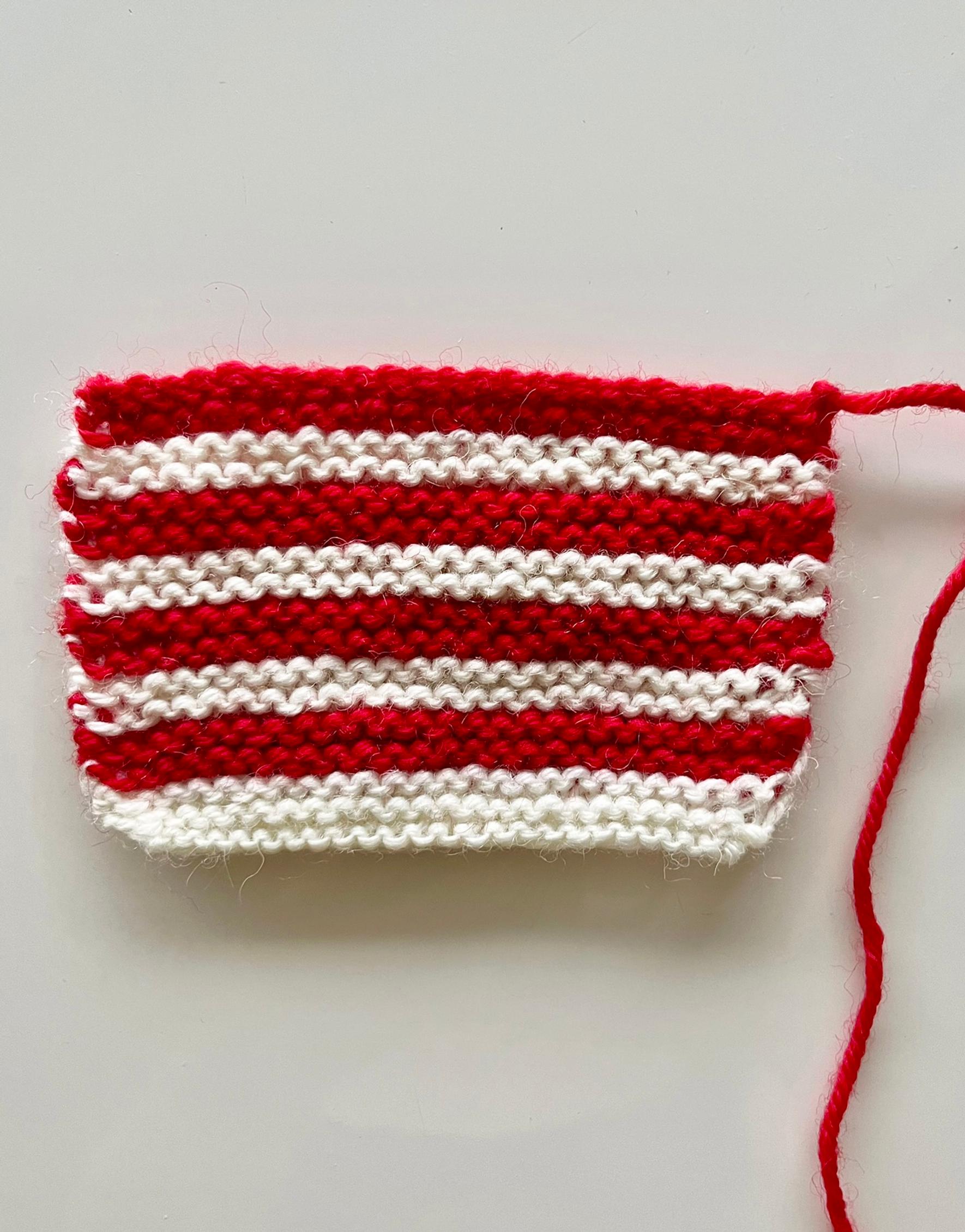 2. Vaihda punaiseen/vihreään lankaan ja neulo 4 krs ainaoikeinneuletta.