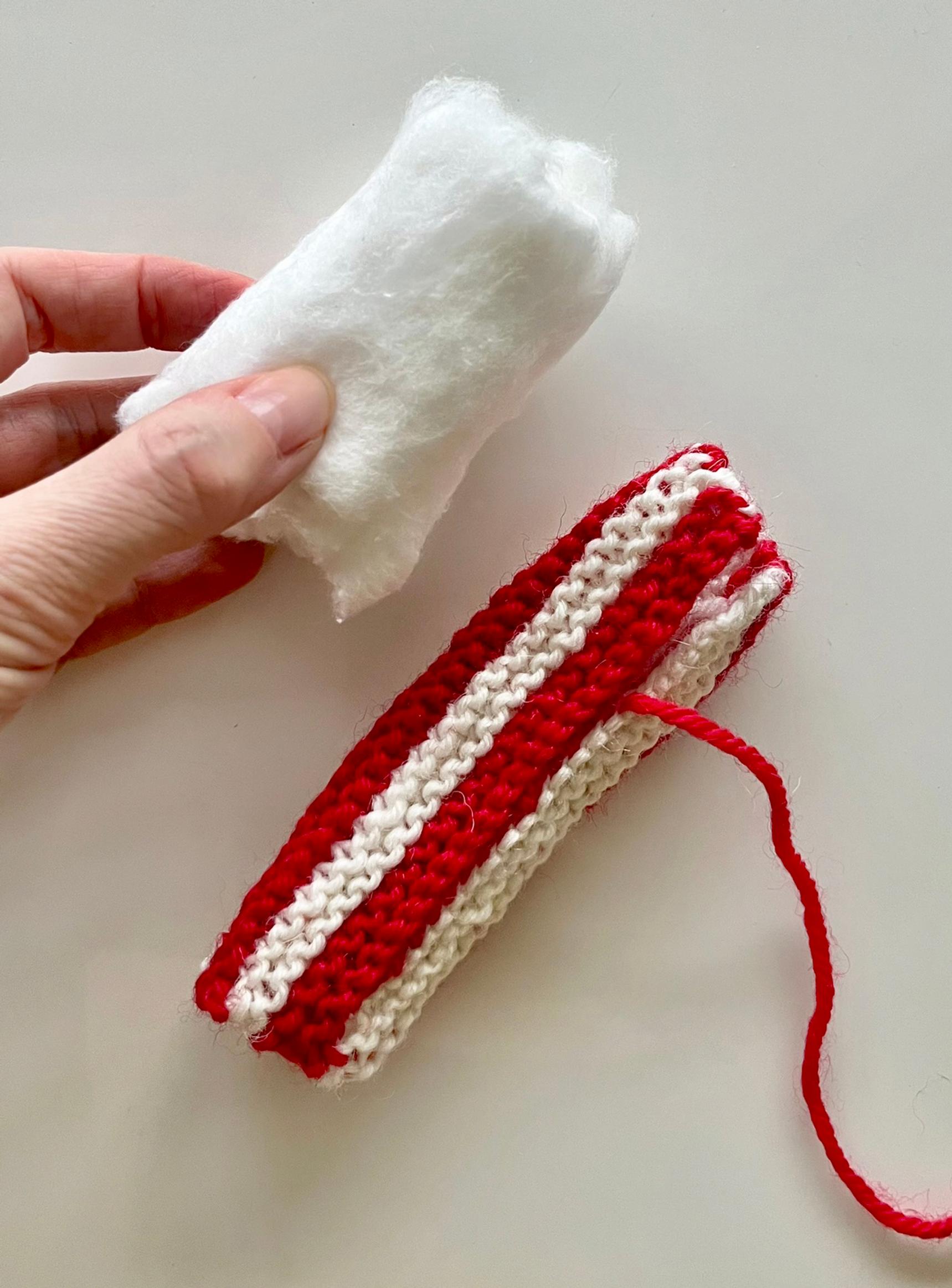 5. Ompele karkin pitkät sivut yhteen. Ompele noin 2/3 pituudesta, täytä karkin keskiosa pumpulilla tai langanpätkillä ja ompele loppuosa kiinni.