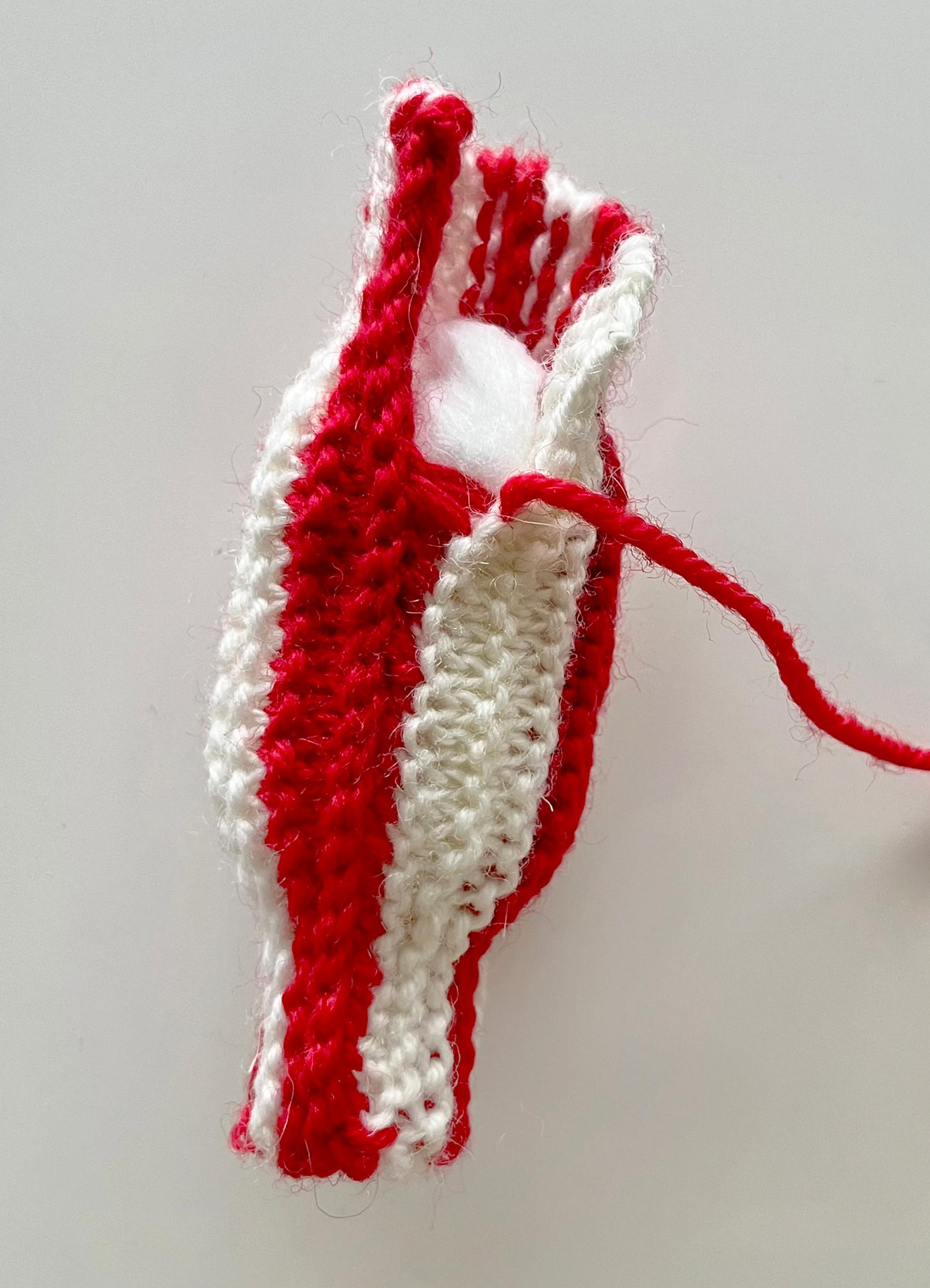 4. Päättele muut, lyhyemmät langat työn nurjalle puolelle. Lankojen päät saavat jäädä sellaisenaan karkkipötkön sisään. Voit myös jättää langat kokonaan päättelemättä ja tunkea ne pötköön piiloon.
