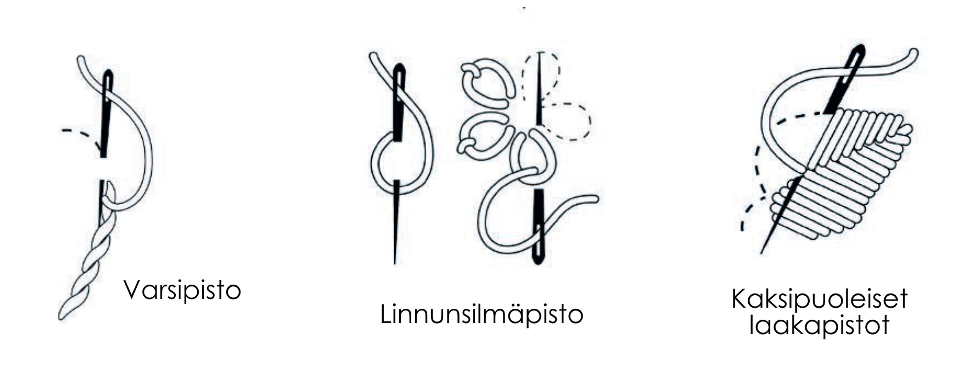 Kirjonta: Kirjo sormikkaiden kämmenselkiin kiemurainen köynnös varsipistoilla, vihreällä langalla. Kirjo sen jälkeen kukkia sinne tänne linnunsilmäpistoilla.