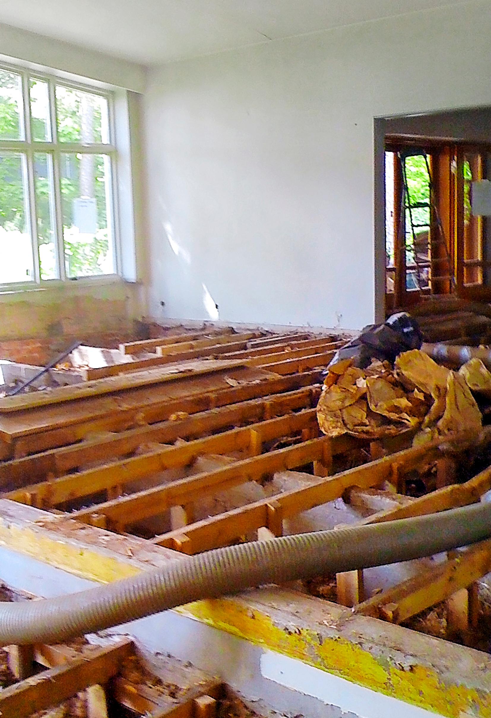 Vastaava rakennusmestari porasi lattiaan reiän nykyisen ruokasalin kohdalle varmistaakseen lattiarakenteen kunnon. Porausreikää jouduttiin suurentamaan, ensin kymmeneen senttimetriin ja sitten vielä metriin. Näin paljastuivat talon alapohjassa lainehtiva vesi ja homeiset rakenteet. Kuntokartoitusraportissa kyllä kerrottiin salaojituksesta, mutta se jäi mainitsematta, että salaojat olivat virheellisesti vain parinkymmenen senttimetrin syvyydessä.