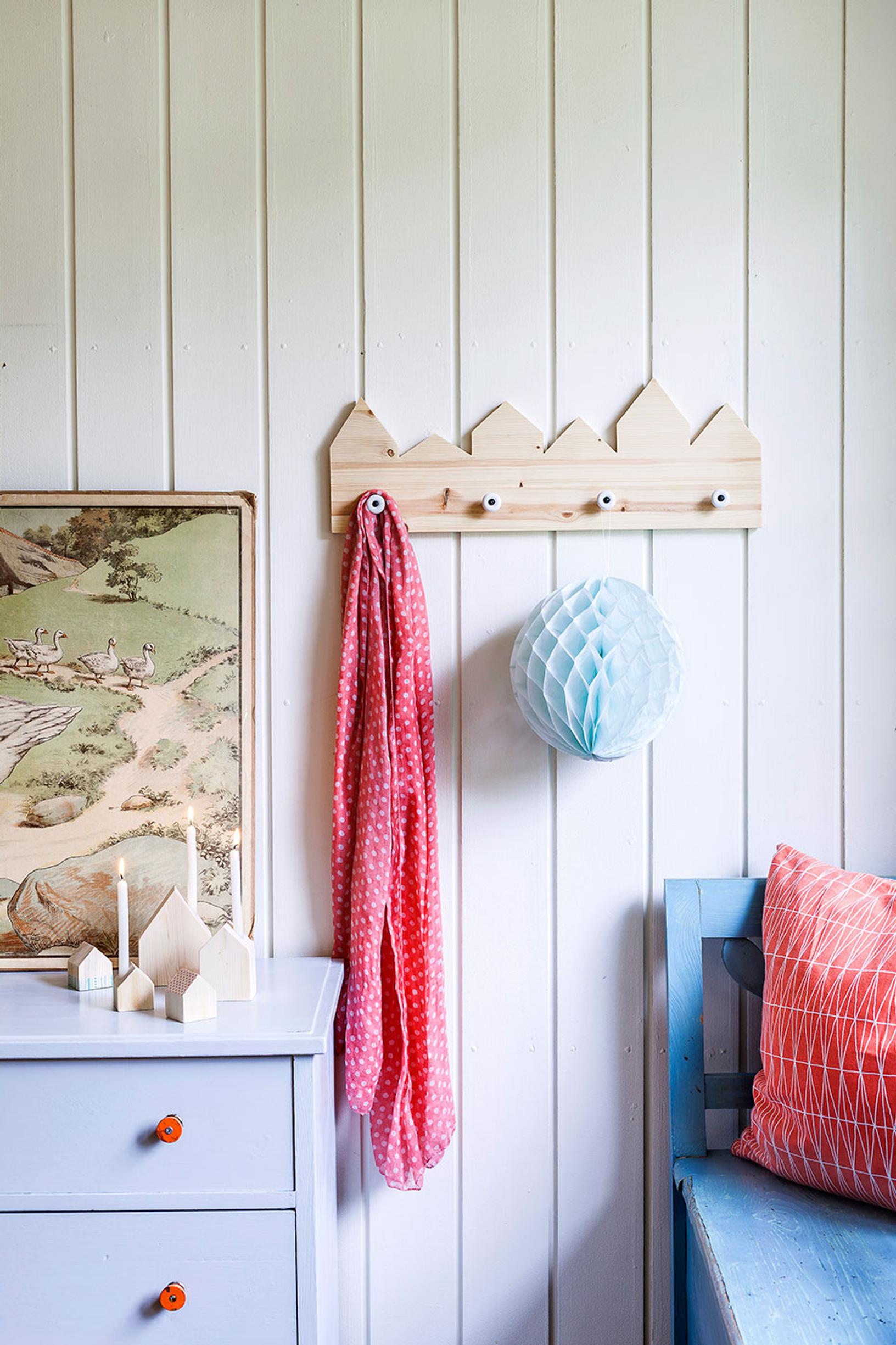 Itse tehty naulakko viimeistelee eteisen. Hyödynnä jämälaudat nikkaroimalla niistä hauska talonmallinen naulakko.