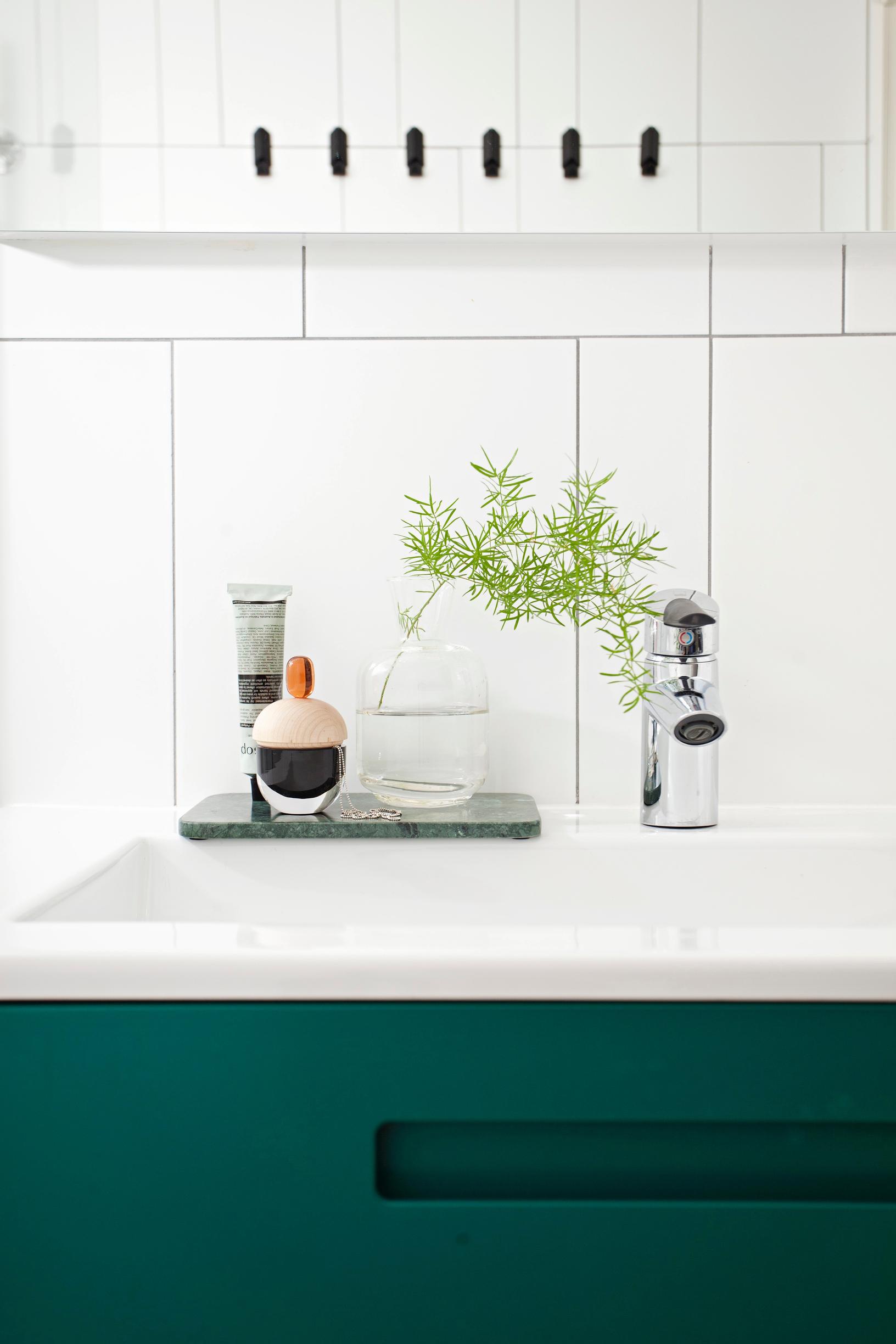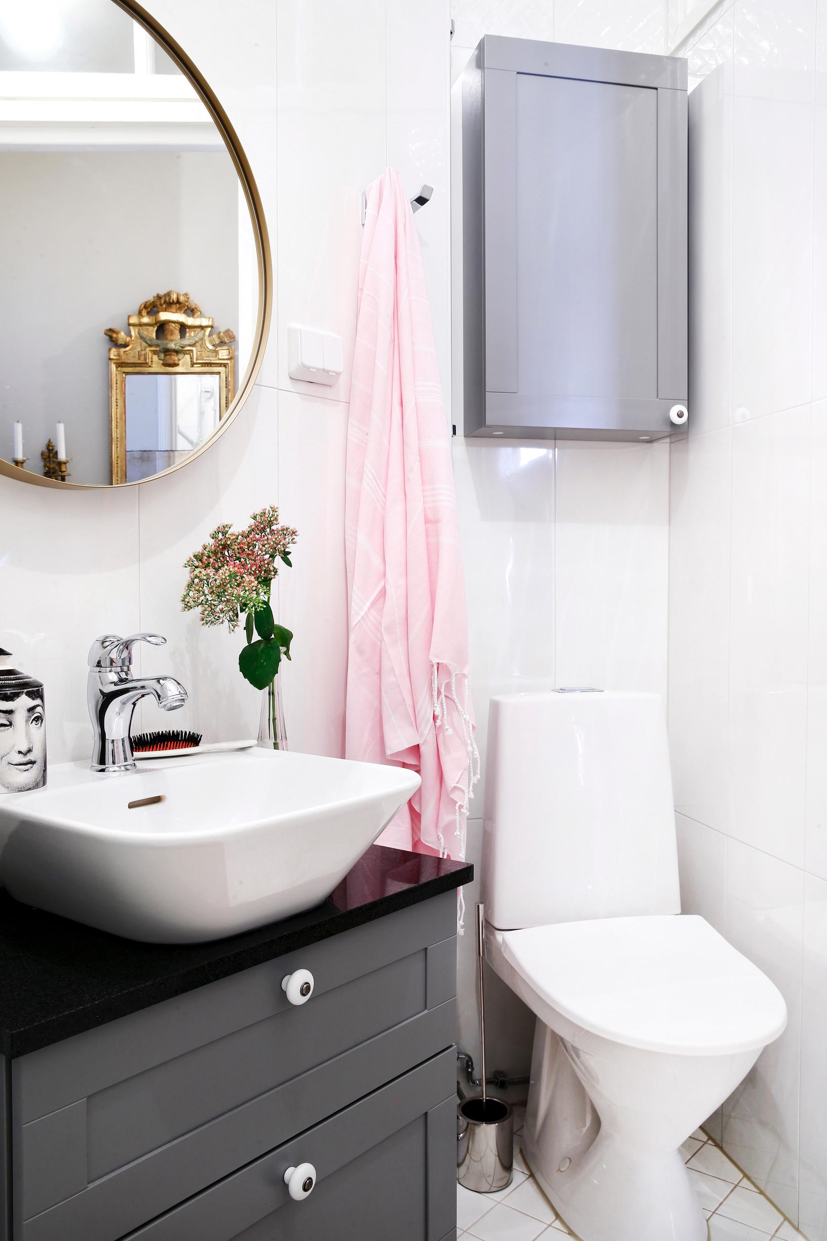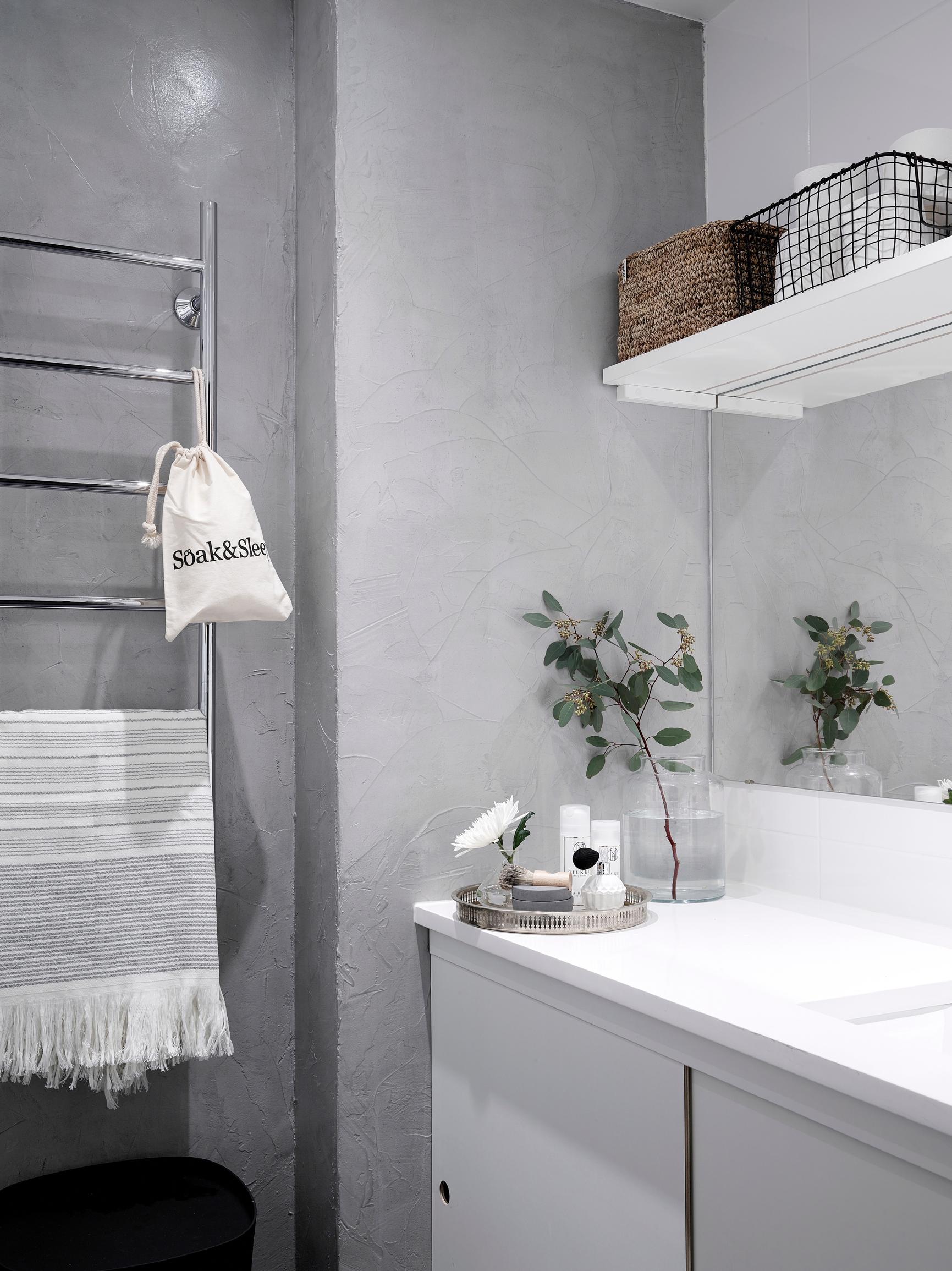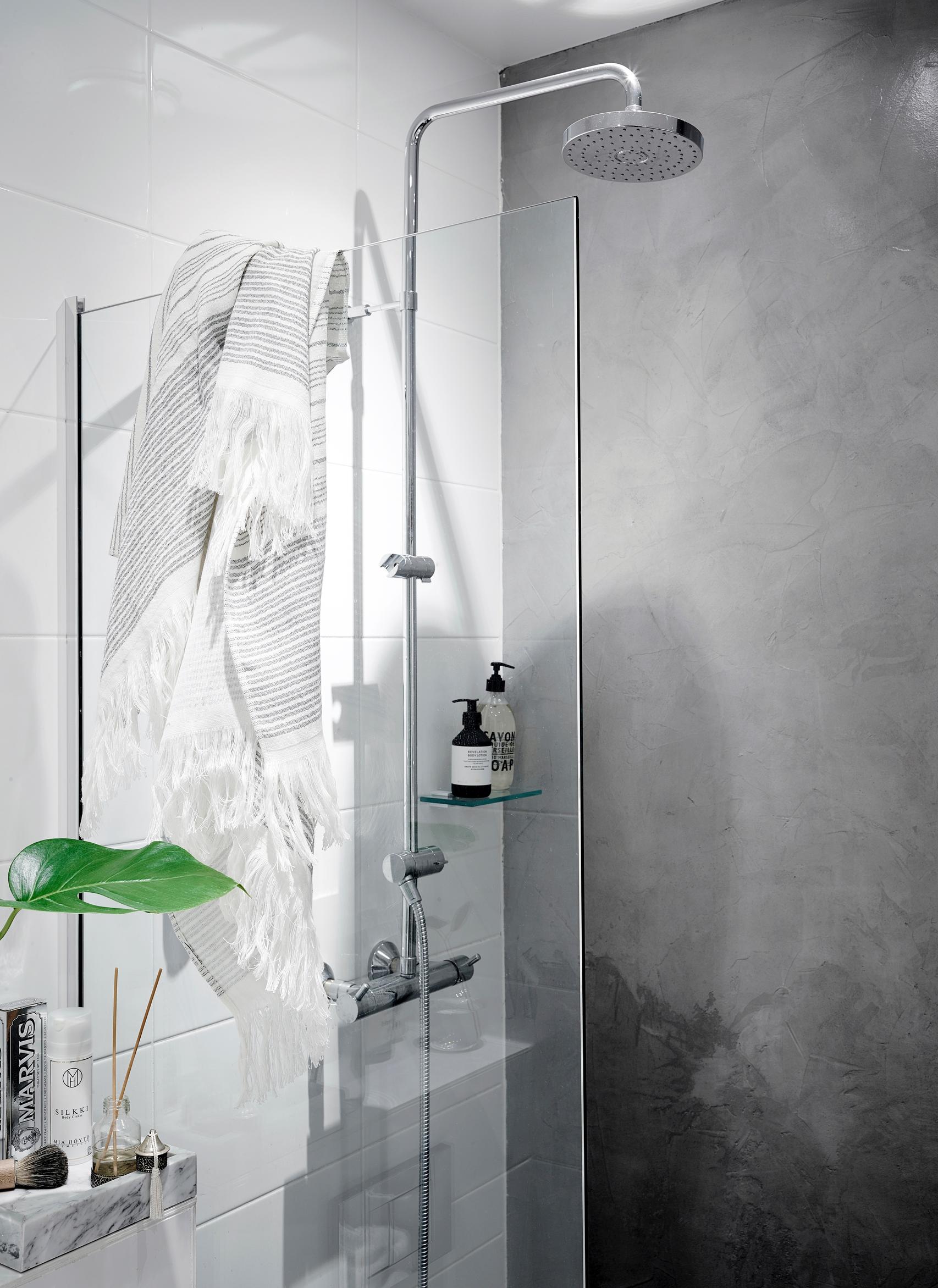 Kerrostalokaksion pieni kylpyhuone on remontoitu pelkistetyn kauniiksi sisustussuunnittelija Laura Seppäsen ideoin. Normaalia kapeammalla valkoisella saumalla ja kaakeleiden tasaladonnalla on syntynyt yhtenäinen, valoa hyvin heijastava tausta varsinaiselle katseenvangitsijalle. Se on betonilaastilla toteutettu tehosteseinä. Arvokasta lisätilaa on saatu seinäasenteisella wc-istuimella sekä avohyllyköllä ja säilytyskoreilla.