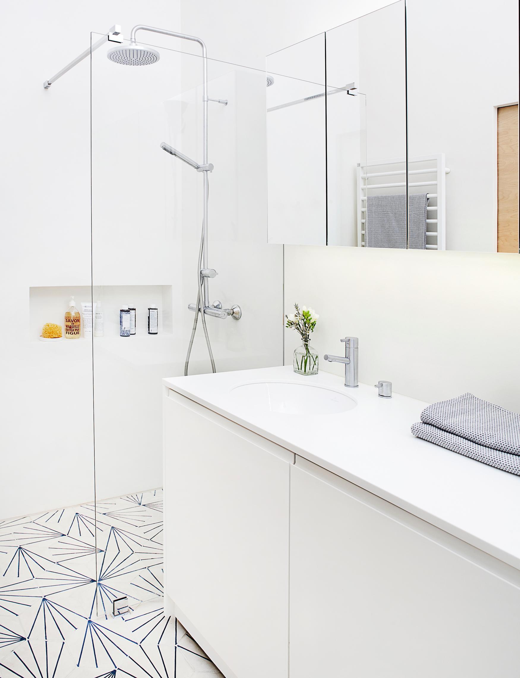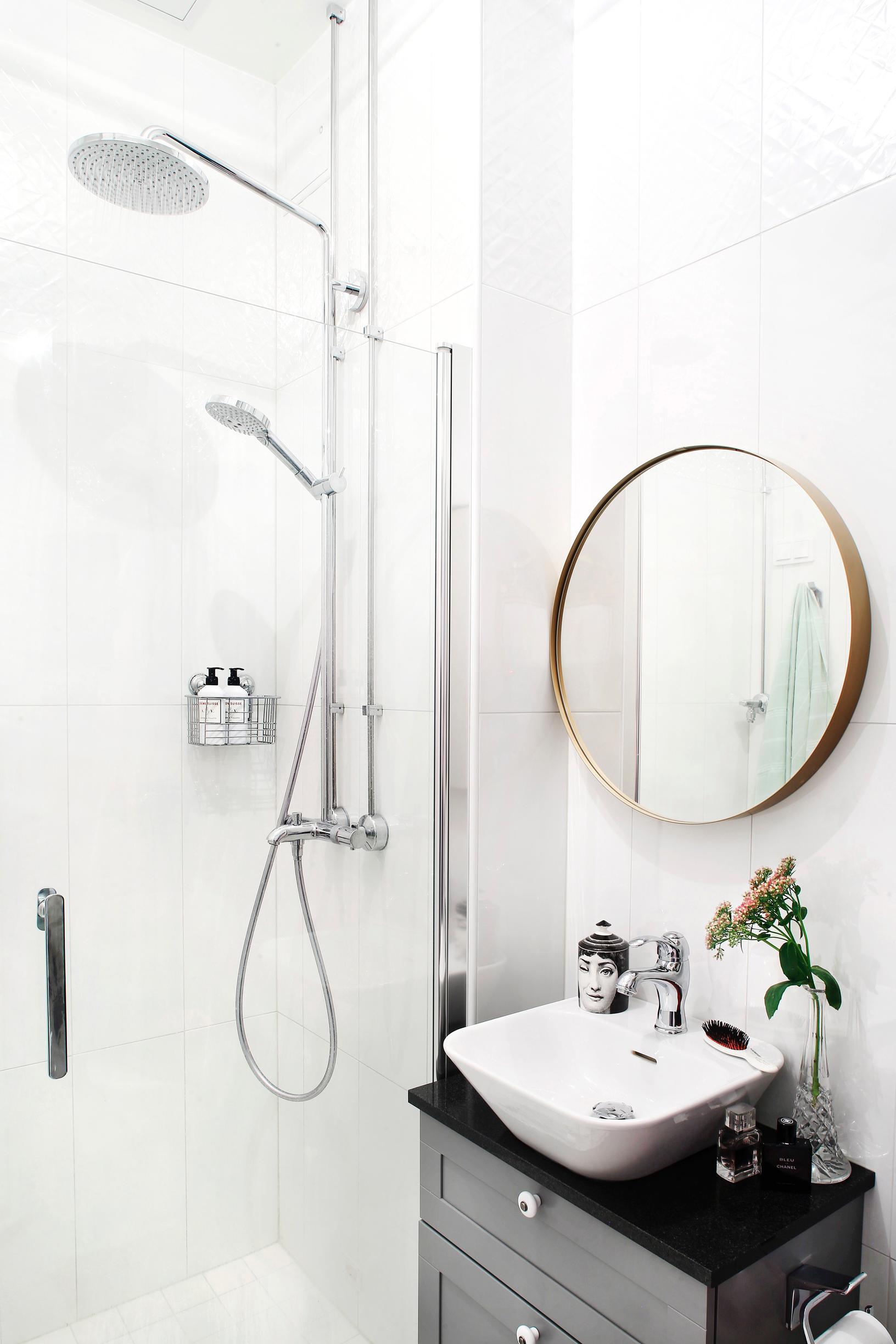 Tässä tilassa on vain 3,9 neliötä, eikä siihen mahdu esimerkiksi pyykkihuoltoa. Siitä huolimatta pieni kylpyhuone tuntuu avaralta. Pystysuuntaisesti asennettu seinälaatoitus on valkoinen ja peilimäisen kirkas, jotta valoisuus korostuisi. Perinteinen suihkukaappi vaikuttaisi tilassa liian kookkaalta ja tekisi siitä ahtaanoloisen, joten sen sijaan on valittu kirkaslasinen jakoseinä. Koska kylpyhuone on 1900-luvun alun talossa, tyyli toistaa sen klassista tunnelmaa. Klassisuus näkyy kaikissa materiaaleissa ja muodoissa.