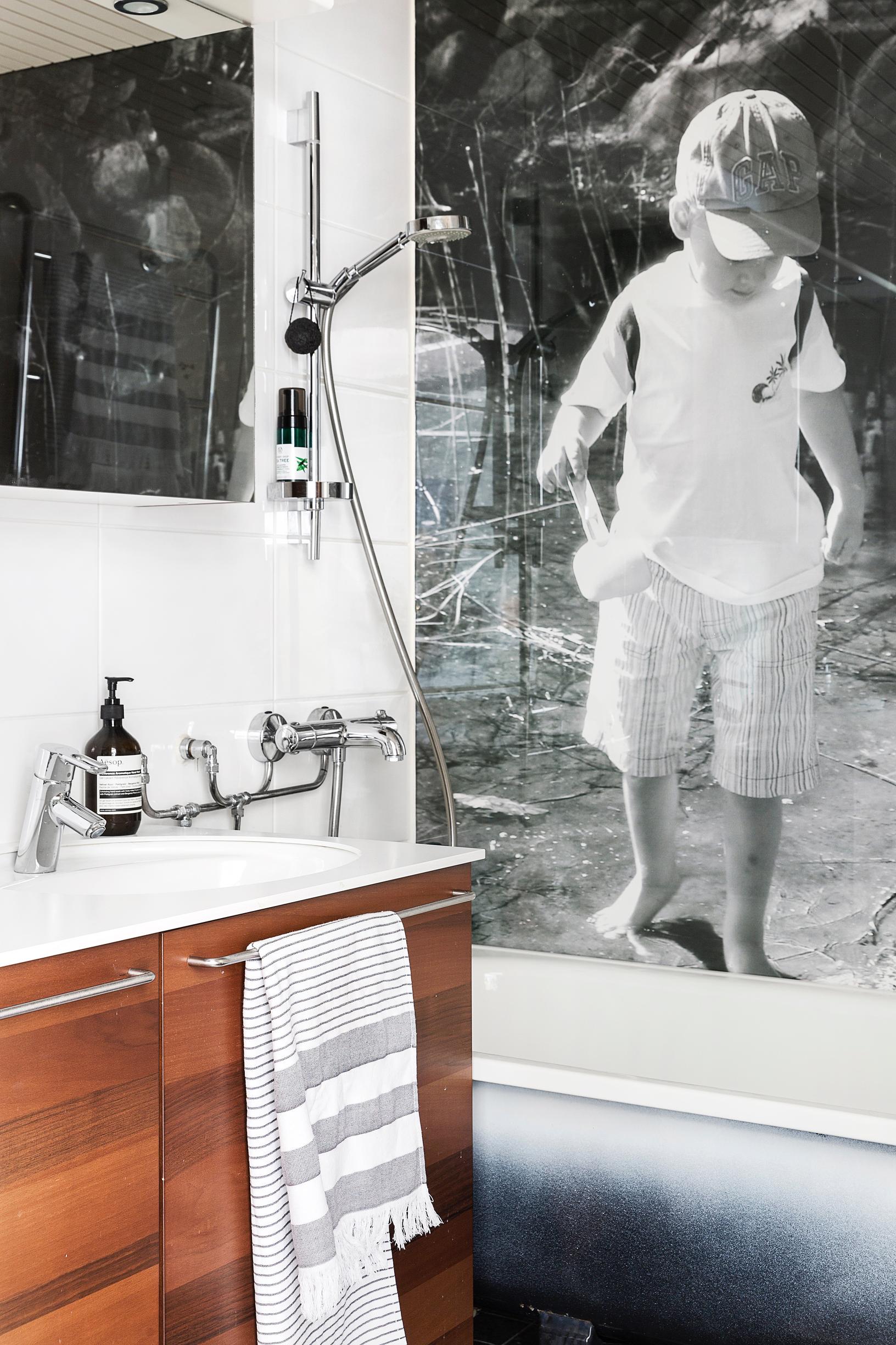 Uniikki pesutila muodostuu, kun yhdistelee itselleen mieluisia elementtejä. Ei haittaa, vaikka ne olisivat erityylisiä ja eri-ikäisiä. Tässä tilassa allaskaluste ja hanat ovat uudet, mutta emalipintainen kylpyamme on vanha. Hellyttävin ja omaleimaisin piirre on takaseinälle teetetty seinän kokoinen valokuva perheen pojasta. Kuva on roiskesuojattu läpinäkyvällä pleksillä.