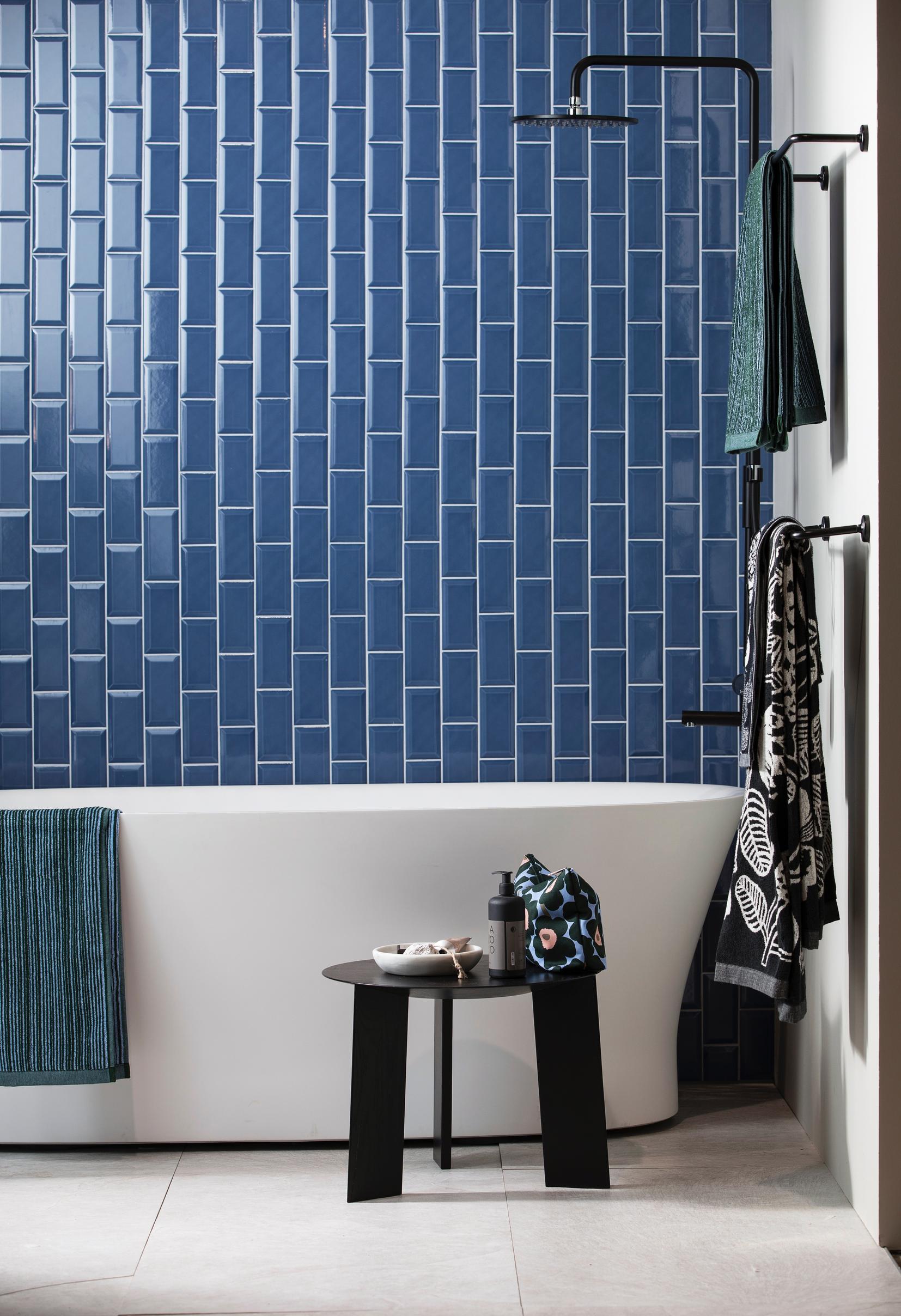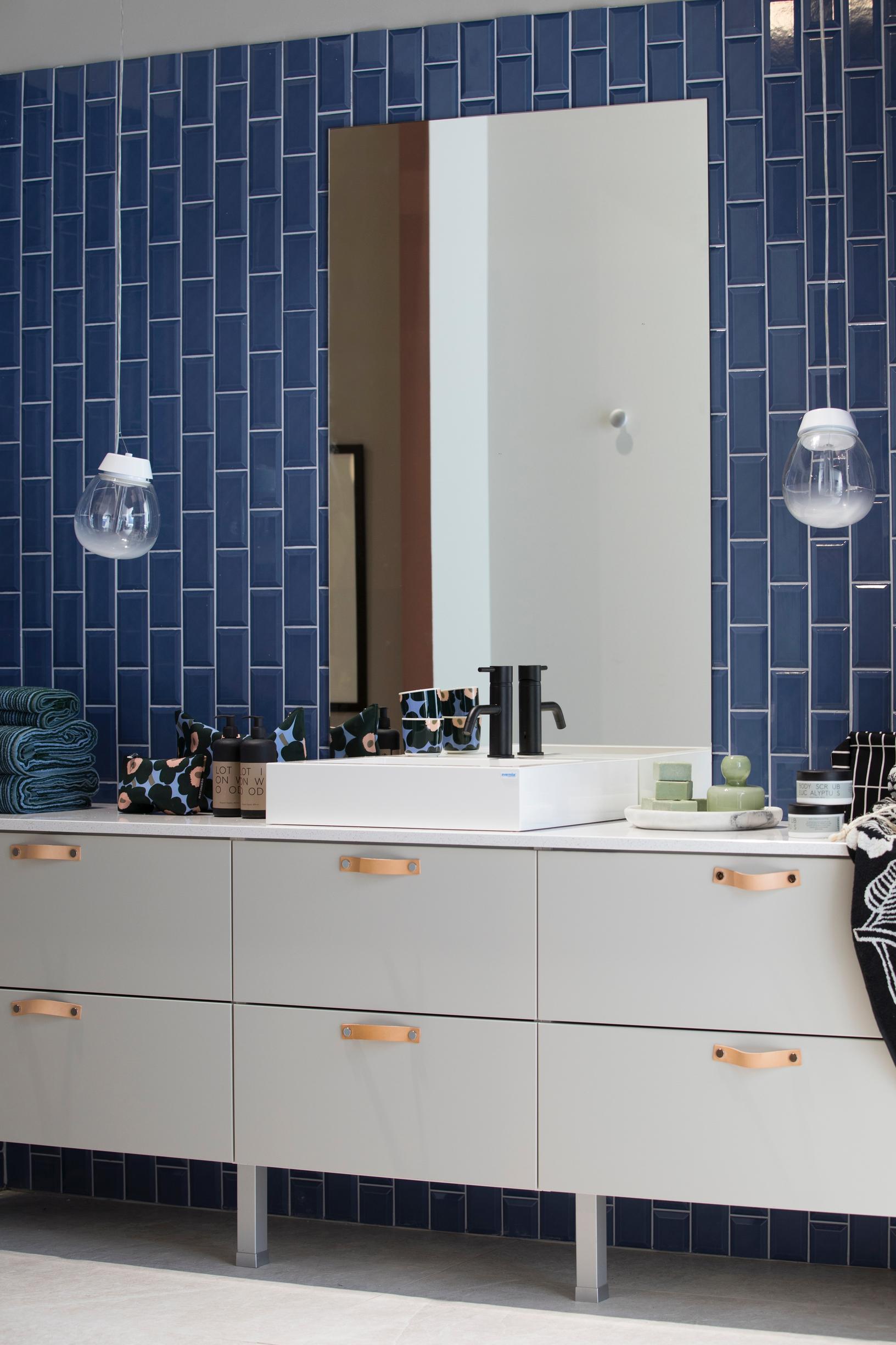 Tätä viime syksyn Habitare-messuilla Avotakan osastolla esiteltyä kylpytilaa hallitsee Pukkilan huima lemmikinsininen Metro-laatta, joka on ladottu pystytiililadontaan niin, että tila saa lisää korkeudentuntua. Kaverikseen se on saanut Pukkilan ison hiekanvärisen Blackboard-lattialaatan ja Topi-Keittiöiden allaskalusteen. Musta suihku ja hana ovat Tapwellin. Kylpyhuoneen kokonaisuuden on suunnitellut sisustusarkkitehti Maija Rasila, joka tunnetaan myös Pihkala-blogistaan.