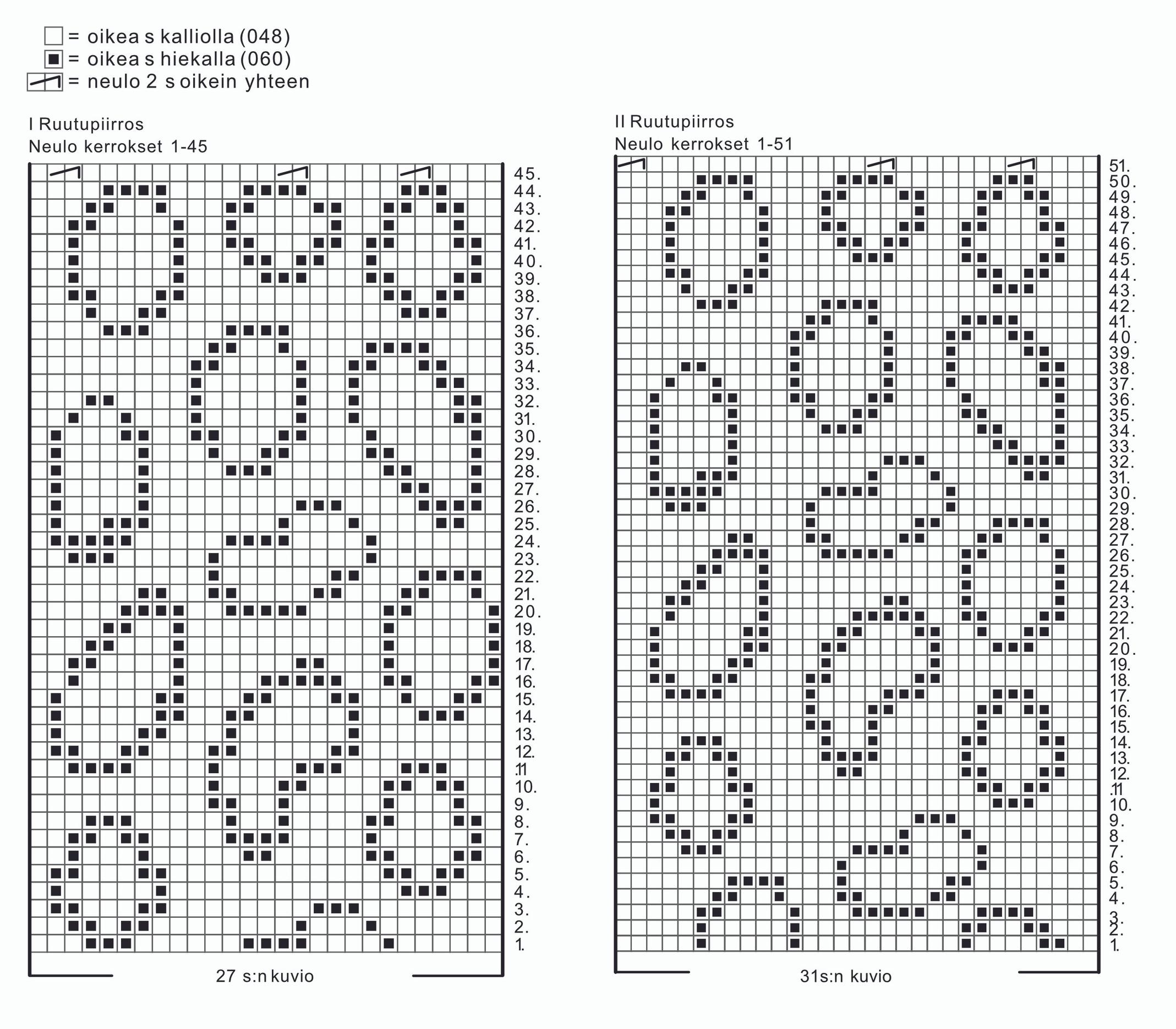 Kirjoneule suljettuna neuleena: neulo sileää neuletta suljettuna neuleena ruutupiirroksen mukaan. Kohdissa, joissa kuvion leveys on 5 s tai enemmän, sido nurjalla kulkeva lanka kiertämällä langat toistensa ympäri työn nurjalla puolella.