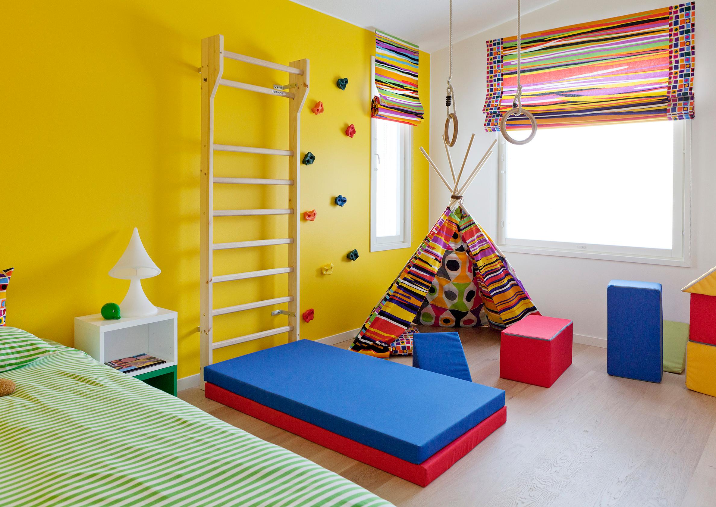 – Lapset ehtivät varmasti ajallaan istua riittävästi kouluissa. Siksi halusimme suunnitella Aapolle huoneen, jossa hänellä on runsaasti aktiivista liikuntaa tarjoavia välineitä, liikuntasuunnittelijana työskentelevä Anna-Leena mainitsee. Hakanin ajatukset kulkevat samoilla aaltopituuksilla vaimonsa kanssa. Turkissa kahden miljoonan asukkaan kaupungissa kasvaneen miehen lapsuuteen kuuluivat päivittäiset peuhaamiset ja liikunnalliset leikit turvallisessa ympäristössä.