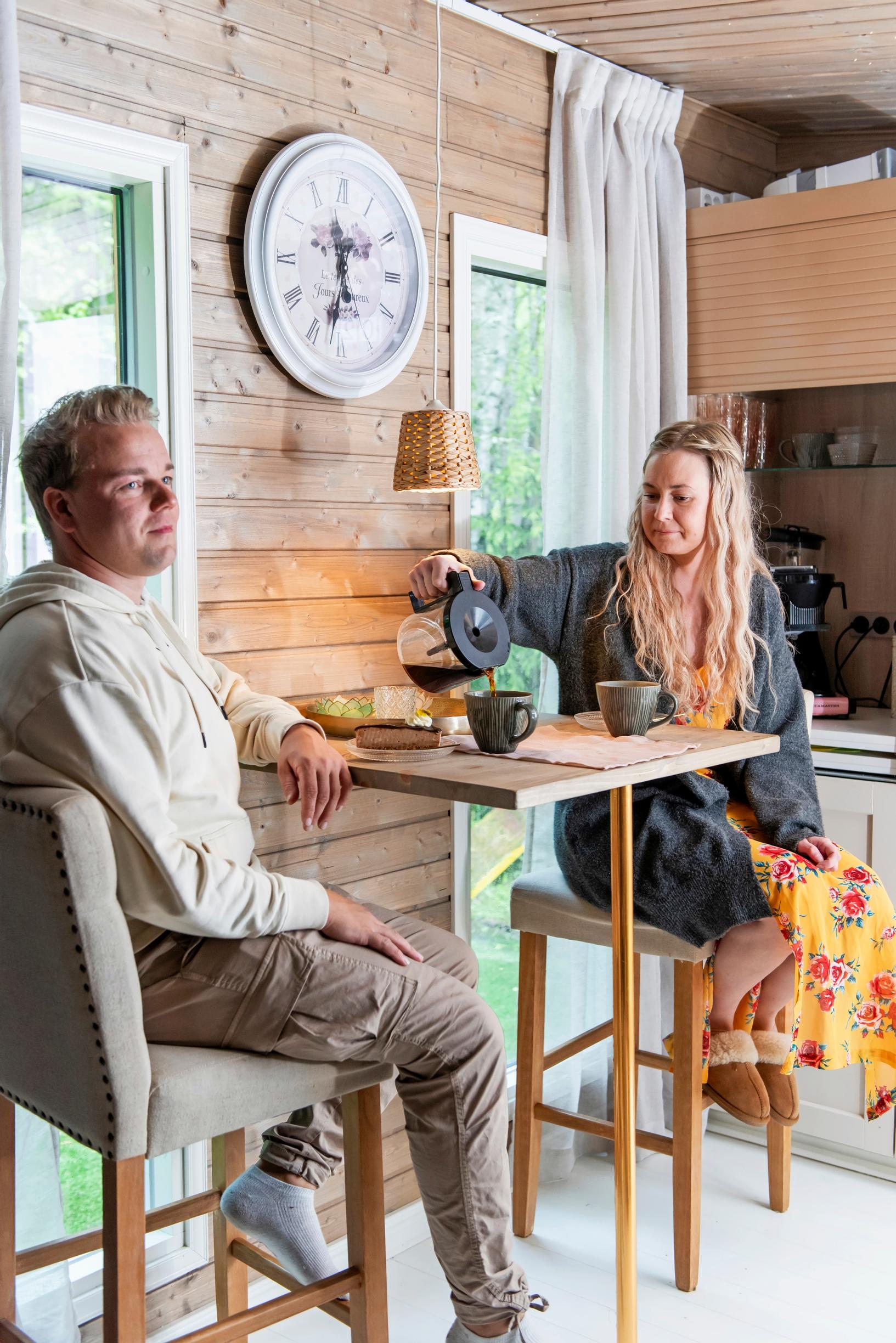 Pariskunta teki talossa kaiken itse. Antolla on puusepän koulutus, Emilialla sähköasentajan pätevyys. Siksi he selvisivät kodin rakentamisesta huomattavasti edullisemmin kuin valmiin ostaminen olisi maksanut.
