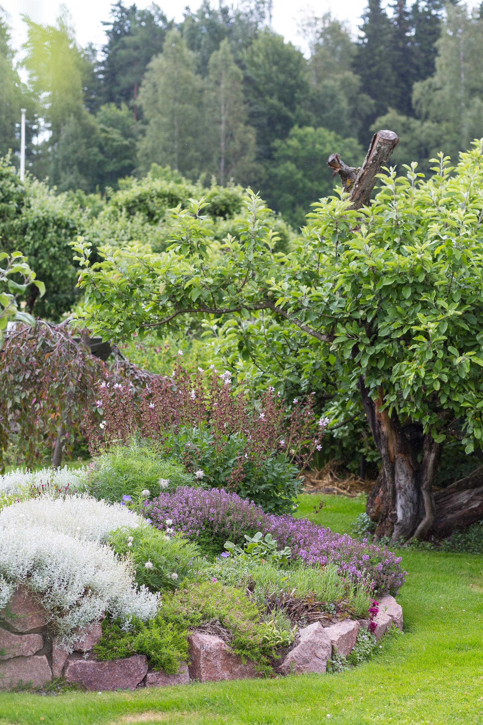 Nurmialue laineilee pehmeästi mutta tarkkarajaisesti istutusalueiden reunoille. Arkkitehtina työskentelevän asukkaan mielestä värejä ei saa olla kerralla liikaa. Vihreän eri sävyjen sekä kellertävien ja harmaansinertävien pensaiden rinnalle puhkeaa alkukesästä violetteja kukkia, kuten jättilaukkoja. Heinäkuussa on punaisten ja keltaisten kukkien aikakausi, elokuussa vaaleanpunaisten vuoro.