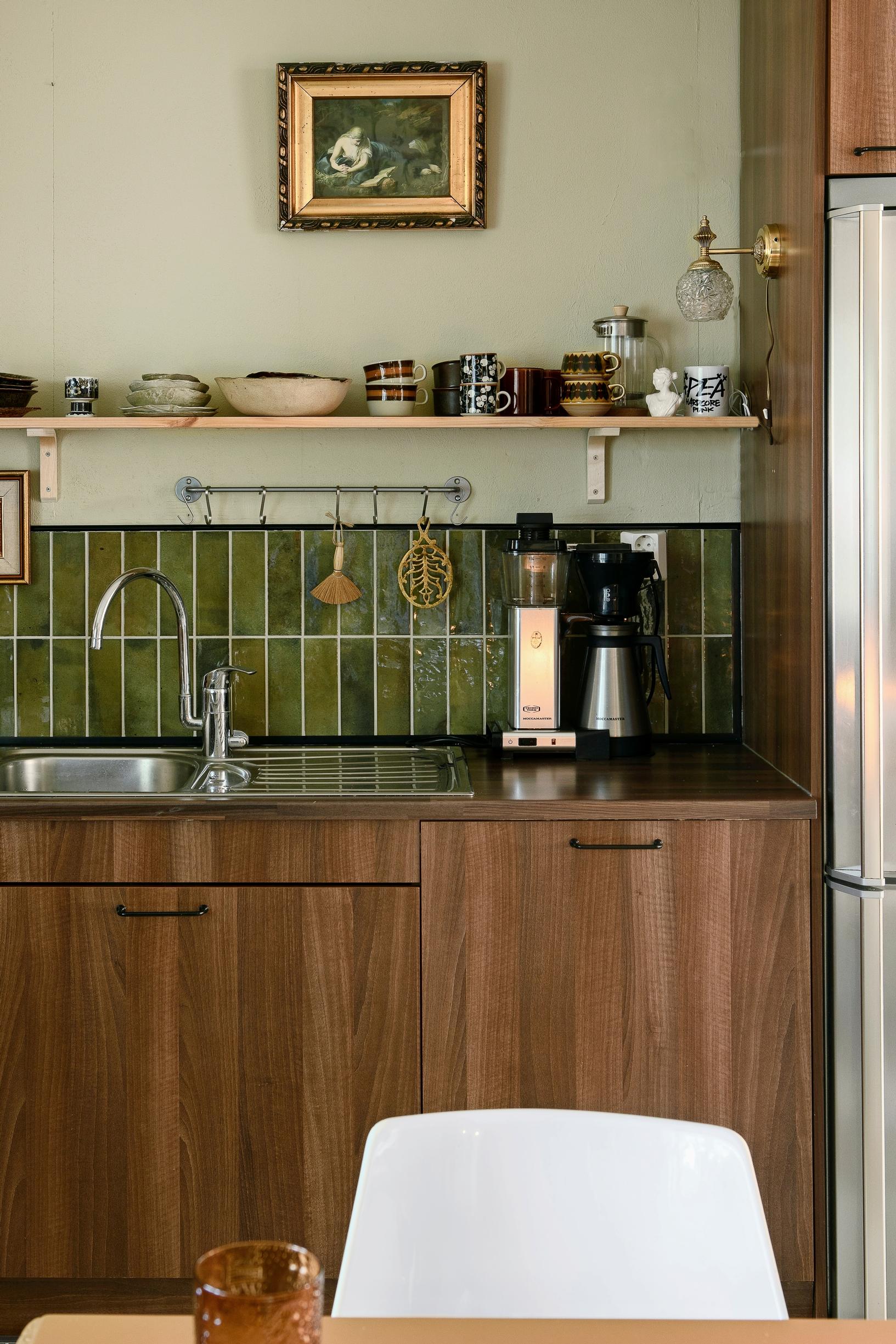 Puustellin kaapistoihin vaihdettiin vain lankavetimet. Seinän sävy on Tikkurilan X457 Apatiitti. Nuusa laatoitti välitilan itse K-raudan laatoilla. Avohyllyllä on esillä osa kahvikuppikokoelmasta. Magdalan Maria -taulu on Torista.