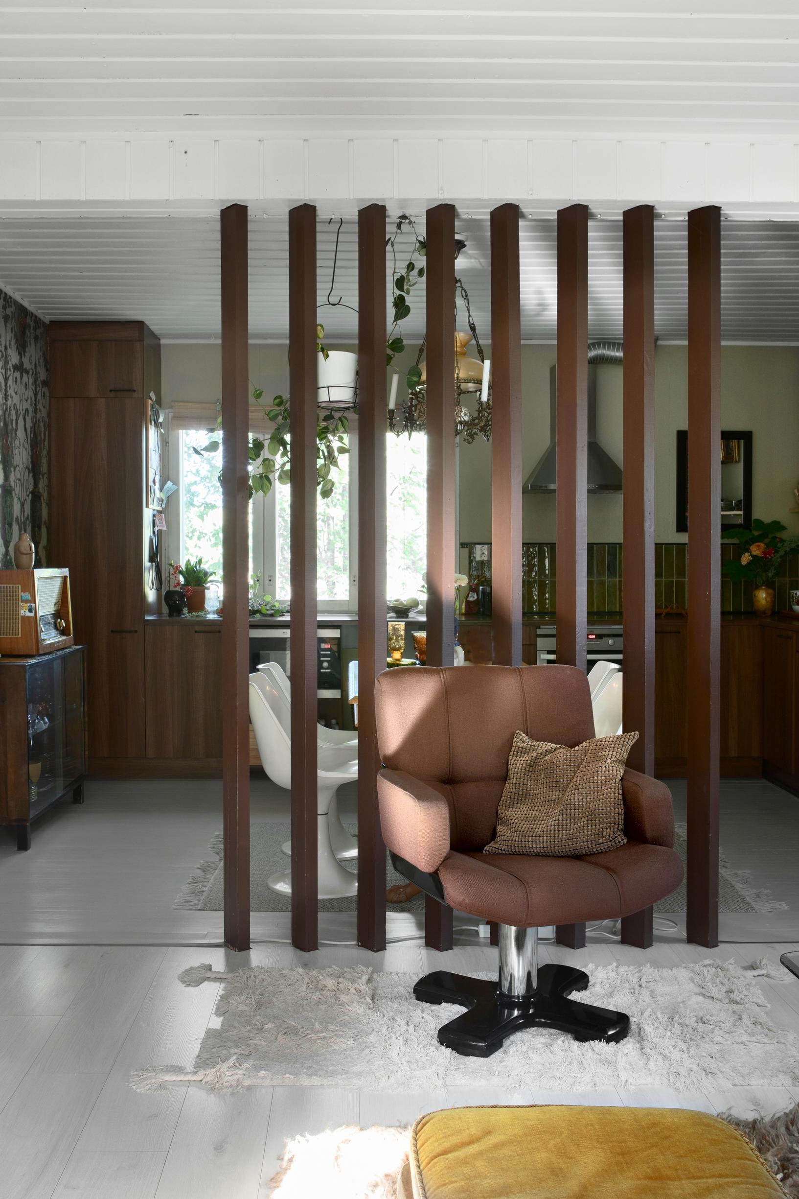 Muutto rintamamiestaloon olivahinko. Olisin halunnut vanhan, hirsisen talon, mutta ihastuin alakerran avaruuteen. Edelliset asukkaat olivat purkaneet olohuoneen ja keittiön välisen seinän ja korvanneet sen talon henkeen sopivalla säleikköseinällä.