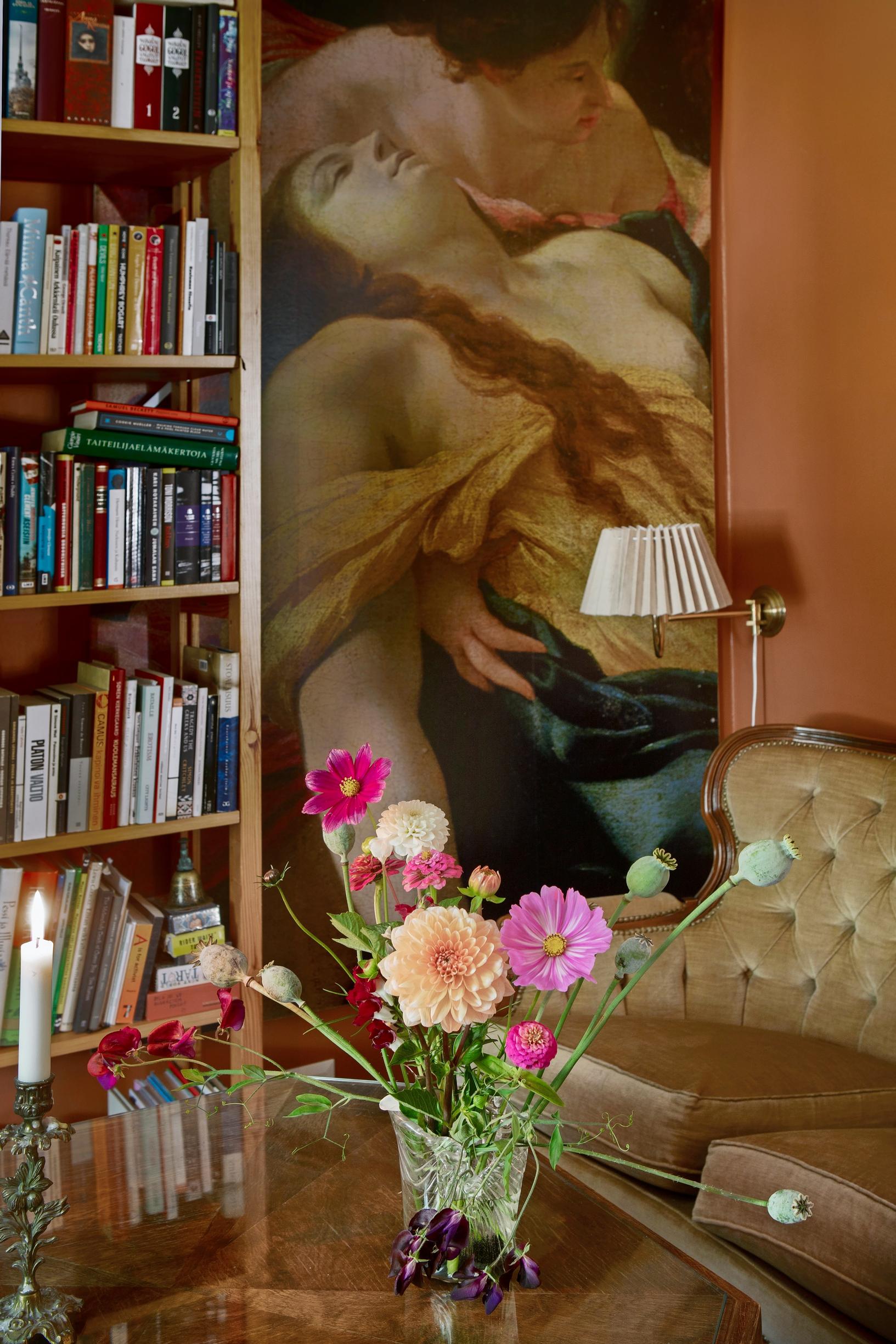 Olen opiskellut myös taidehistoriaa, ja renessanssi-ihailuni näkyy esimerkiksi eteisen valokuvatapetissa, joka on suurennos renessanssiajan supertähden Sandro Botticellin 1400-luvun lopun maalauksesta. Myös kirjasto-työhuoneen seinässä on vanhasta maalauksesta tehty valokuvatapetti. Molemmissa tapeteissa on samaa hurmioitunutta fiilistä. Niissä voi nähdä myös pyhyyttä, jotain arjen tuolle puolen kurottavaa.