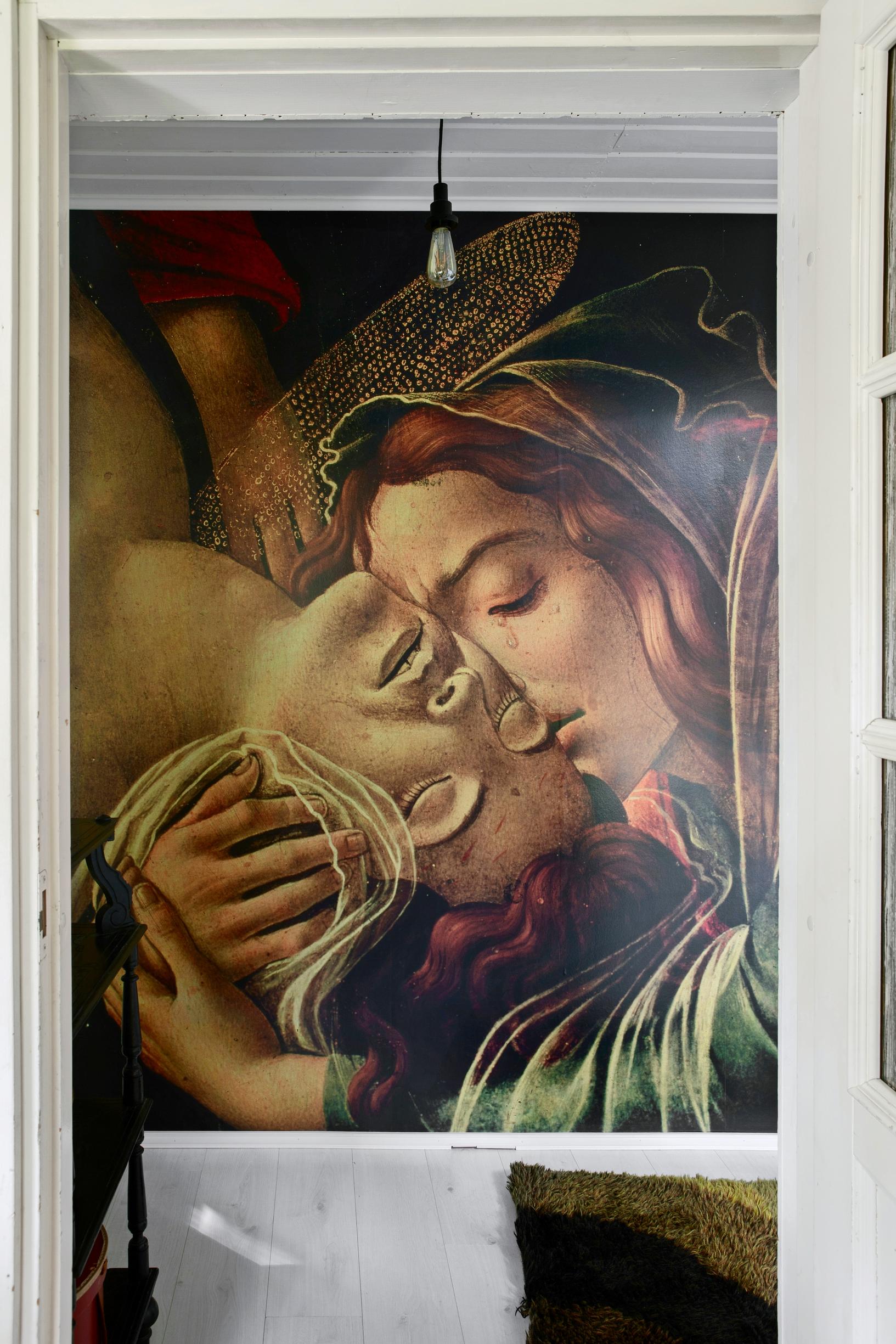 Eteisen tapetissa on suurennettu yksityiskohta Sandro Botticellin teoksesta Compianto sul Cristo morto. Tapetti on tilattu Photowall-verkkokaupasta. Ryijymatto on 1970-luvun kotimaista designia.