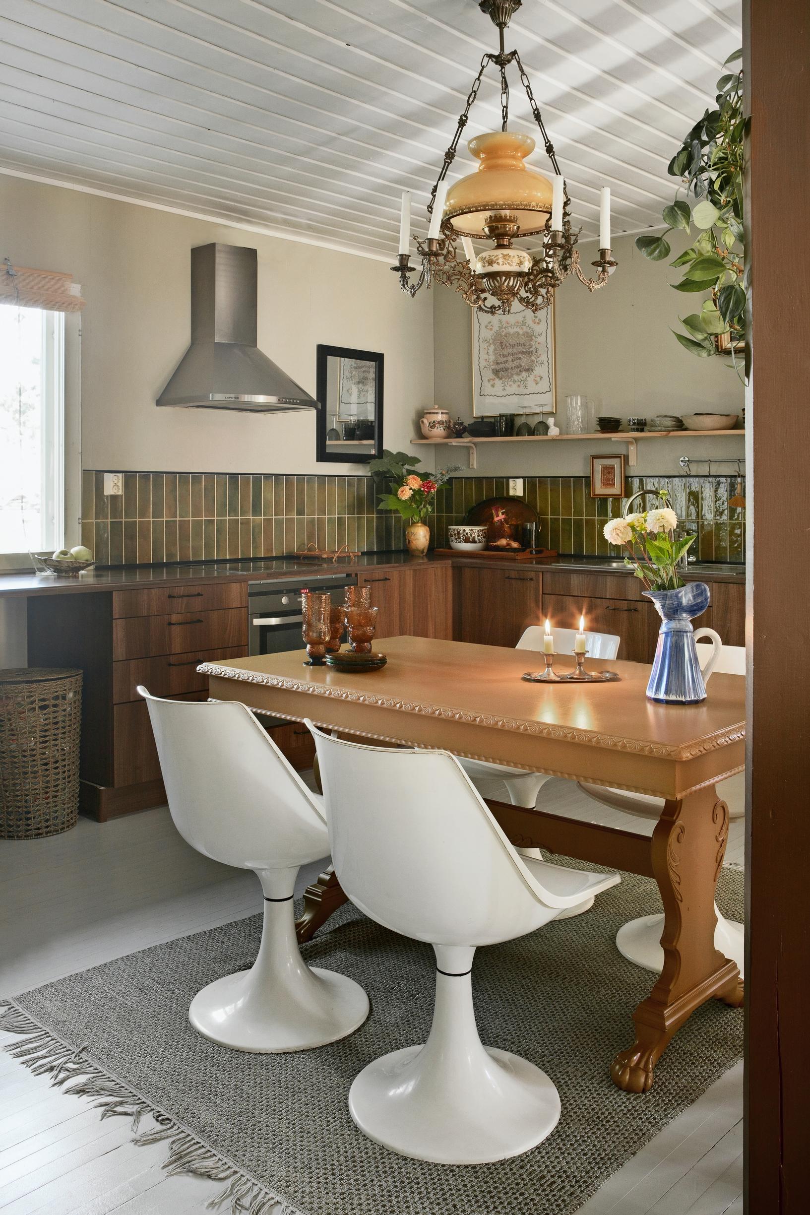 Ruokapöytä on Tori-löytö. Se maalattiin Tikkurilan L396 Mehiläisvaha -sävyllä. Pyörivät tuolit ovat Askon Amigot. Sarjaa valmistettiin valkoisen lisäksi muun muassa keltaisena, ruskeana ja oranssina. Ruotsalainen maitotyttökannu on hankittu tyrnäväläisestä Niitynmaan Nostalgia -puodista. Komea öljylamppu valaisee nykyisin ledin ja kynttilöiden voimalla.