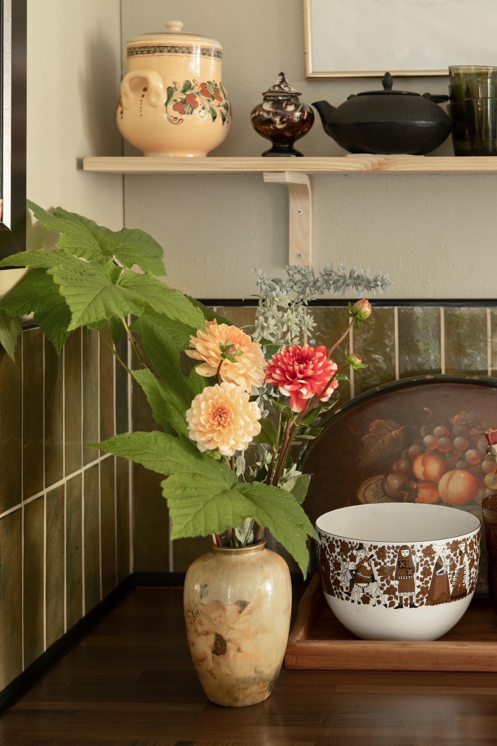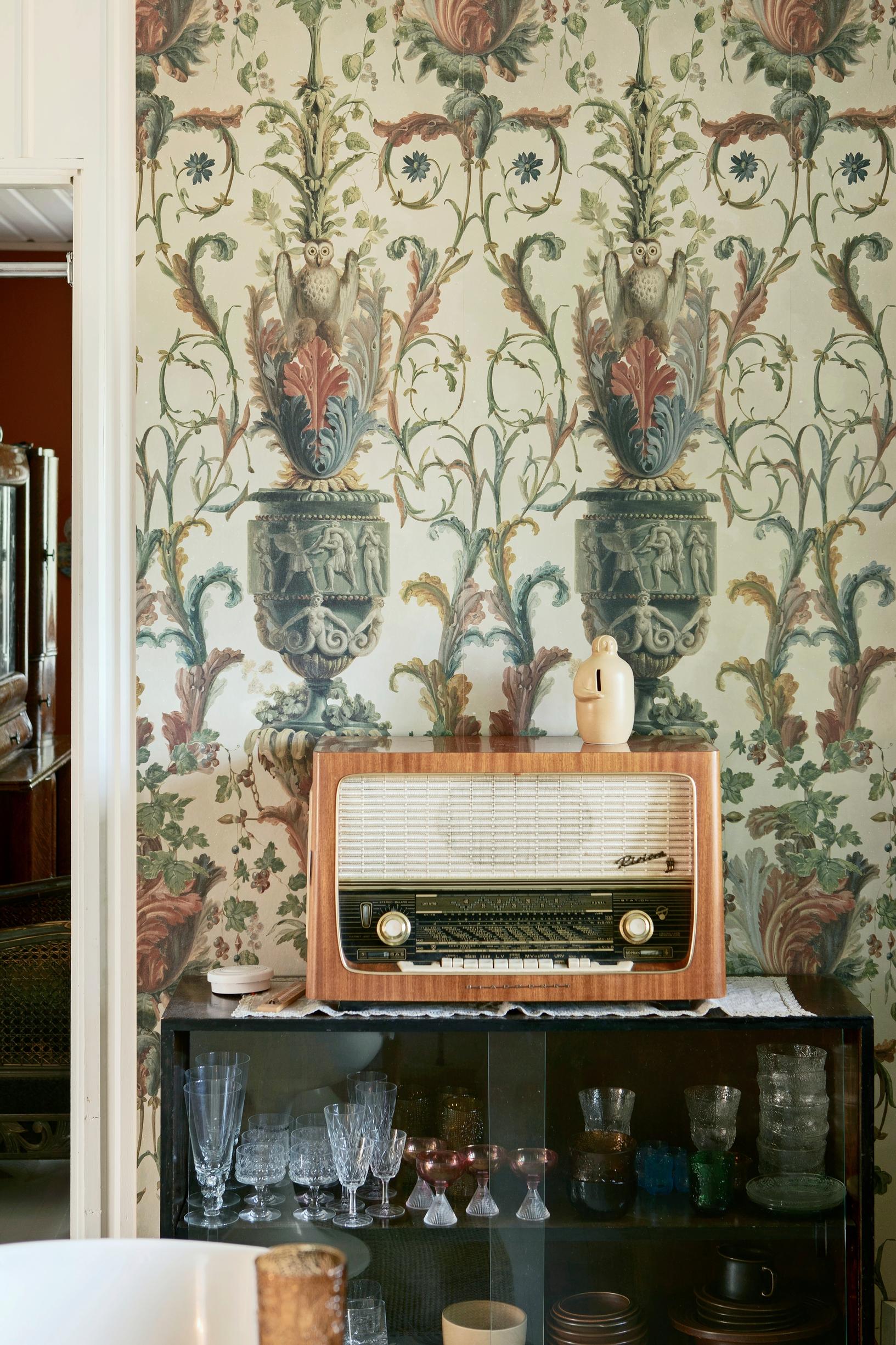 Nuusa kehuu vanhan putkiradion ääntä miellyttävän pehmeäksi. Keittiön sivuseinä on tapetoitu Mindthegapin Le Jardin -tapetilla. Vitriinissä on paikka lasitavaroille, kuten Wirkkalan Briljant-laseille.