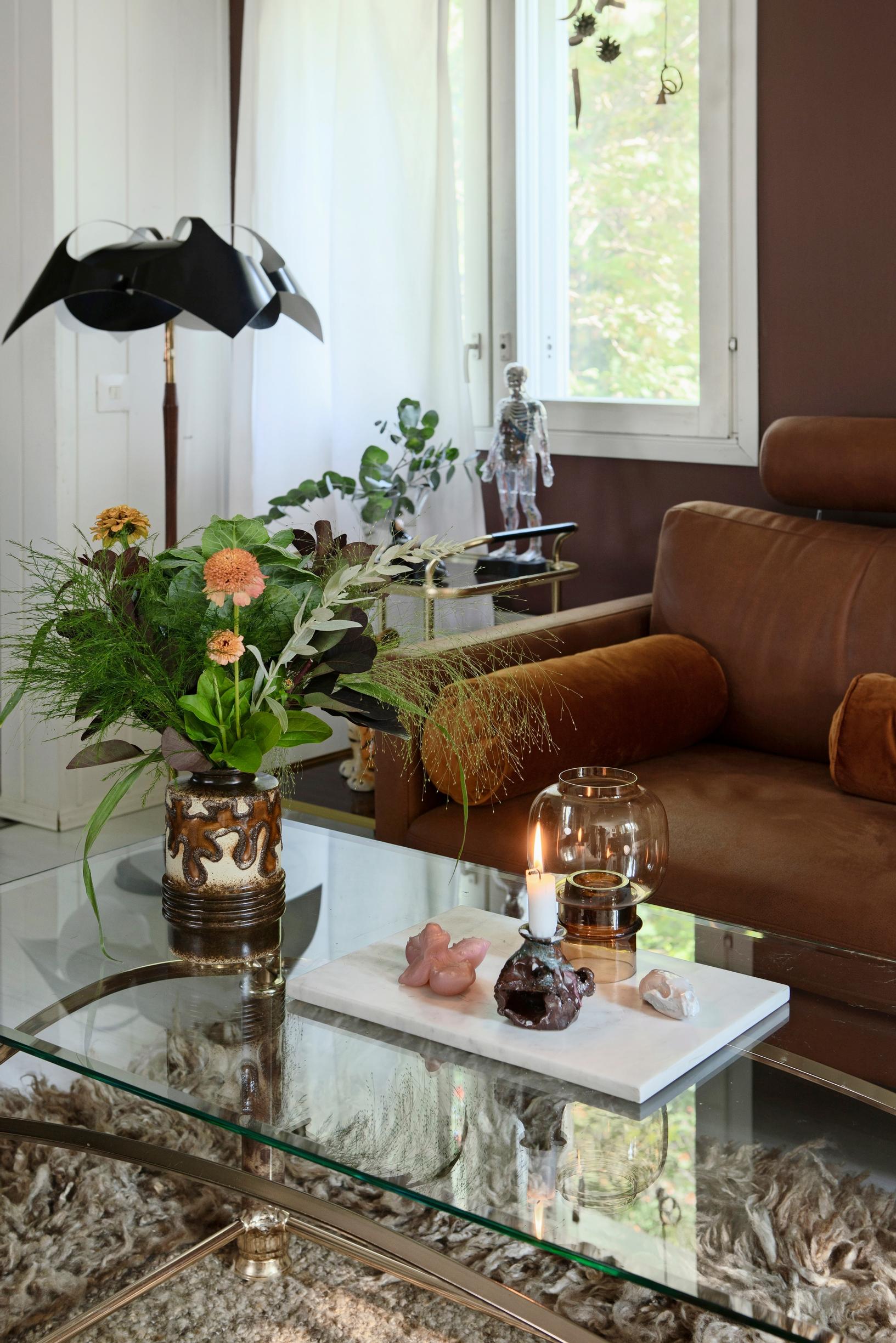 Marmorialusta on ostettu kirpputorilta. Sen päällä on Laura Nevanperän pieni vaaleanpunainen veistos ja matkoilta hankittu keraaminen pääkallo. Ruskea tuikku- ja kynttilälyhty on Heikki Orvolan suunnittelema. Anu Pentikin Kaamoskivi-kynttilänjalka ja ruskea maljakko löytyivät samalla kirpputorireissulla.