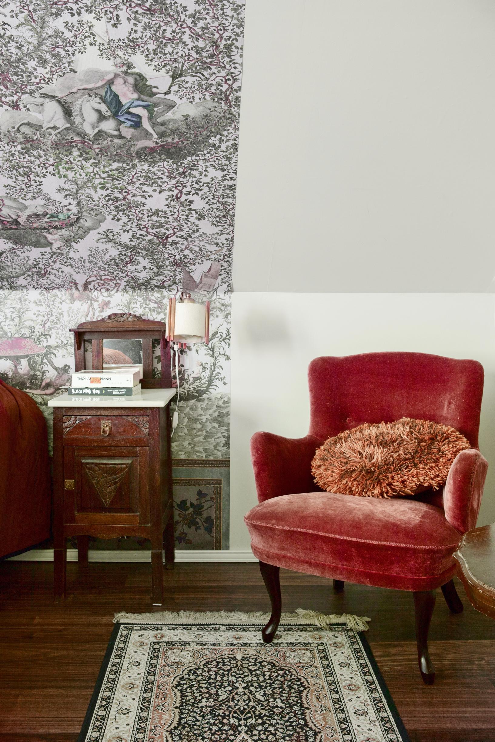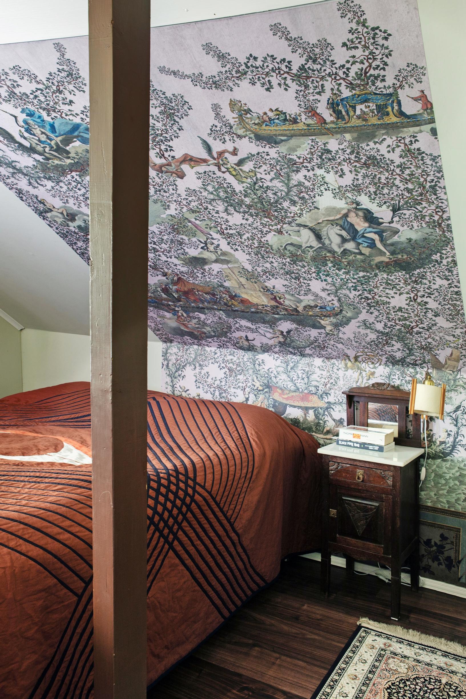 Nuusan ja Nikun makuuhuoneen koriste on Mindthegapin Journey to Eden -tapetti, joka leijuu kuin katos sängyn yllä. Nuusa ihastui tapetin mytologiseen teemaan. Siitä löytää aina jonkun uuden yksityiskohdan. Yöpöytä on kirpputorilta. Yövalaisin on 1960-luvulta.