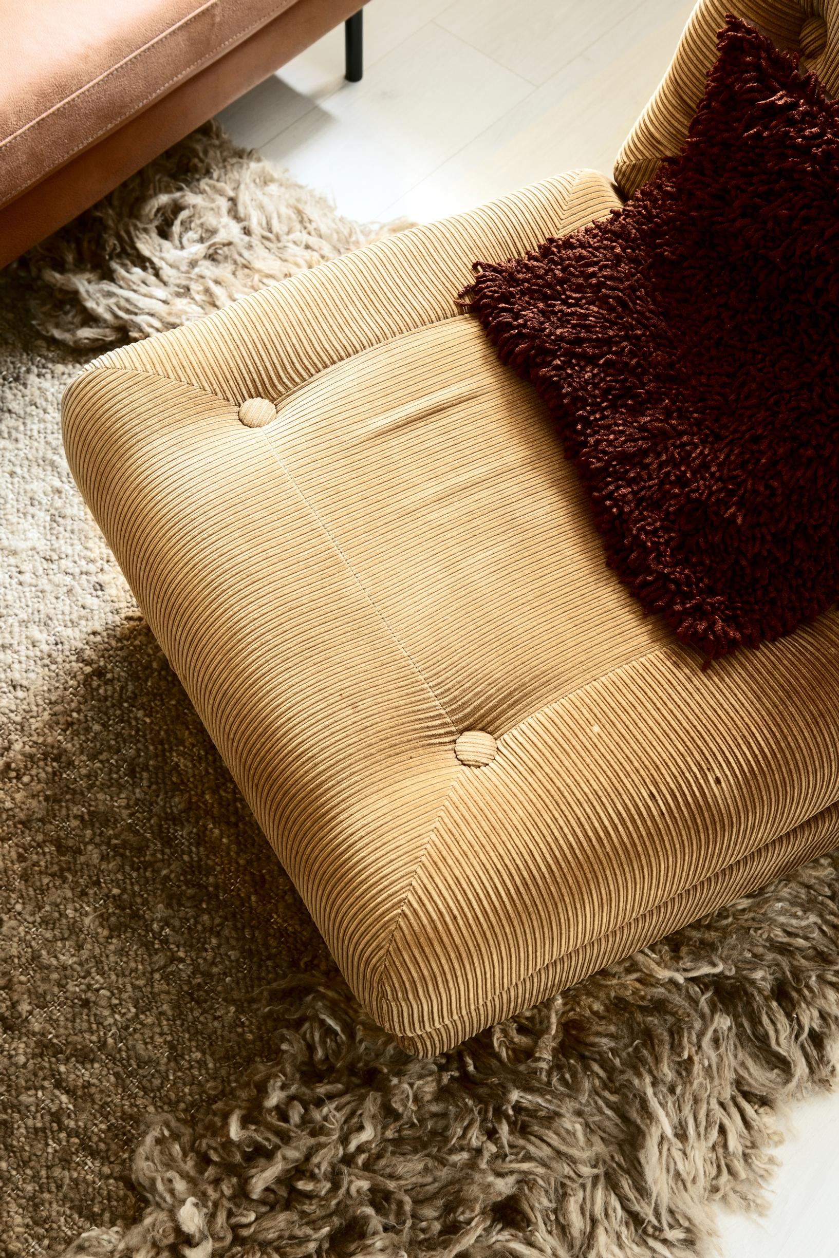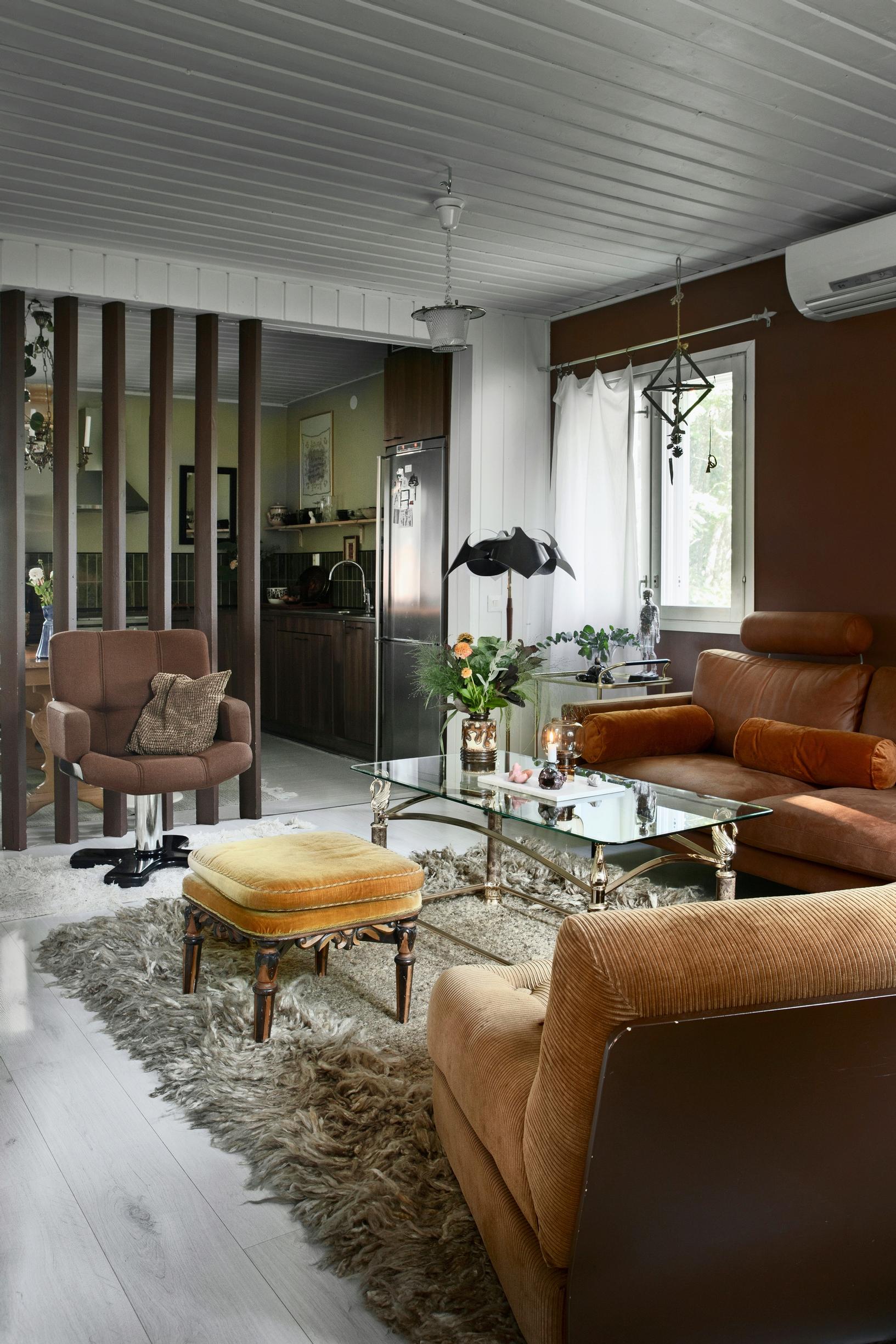 Olohuoneen kalustus on yhdistelmä käytettynä hankittua kulmasohvaa, 1960-luvun pyörivää Nautilus-tuolia ja kasarisohvapöytää. Jakkara on löytö oululaisesta antiikkiliikkeestä. Matto on Marie Olsson Nylanderin Ellokselle suunnittelema.
