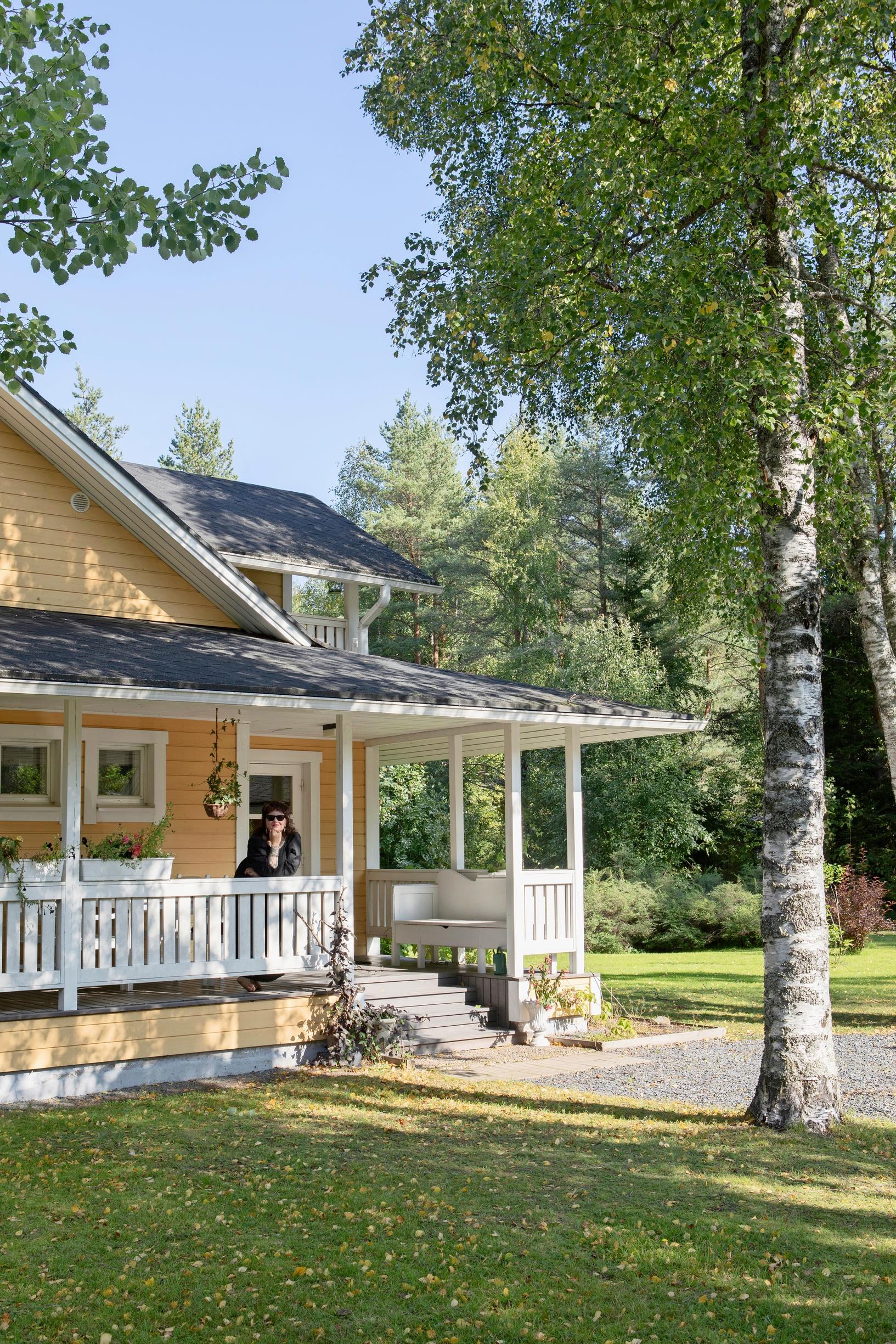 Talon edessä on iso, katettu veranta. Vanha puusohva on Tori-löytö läheisestä maalaistalosta. Nuusa tykkää laittaa puutarhaa mutta ei ota siitä turhia paineita.