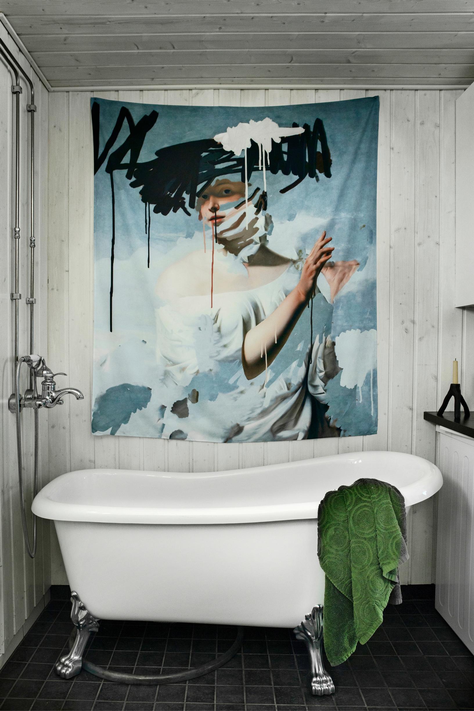 Nuusa osti tassuammeen itselleen syntymäpäivälahjaksi. Pesuhuoneen ilmeen kohottaa tulostus Harmony 5 -teoksesta, jonka on tehnyt Chad Wys.