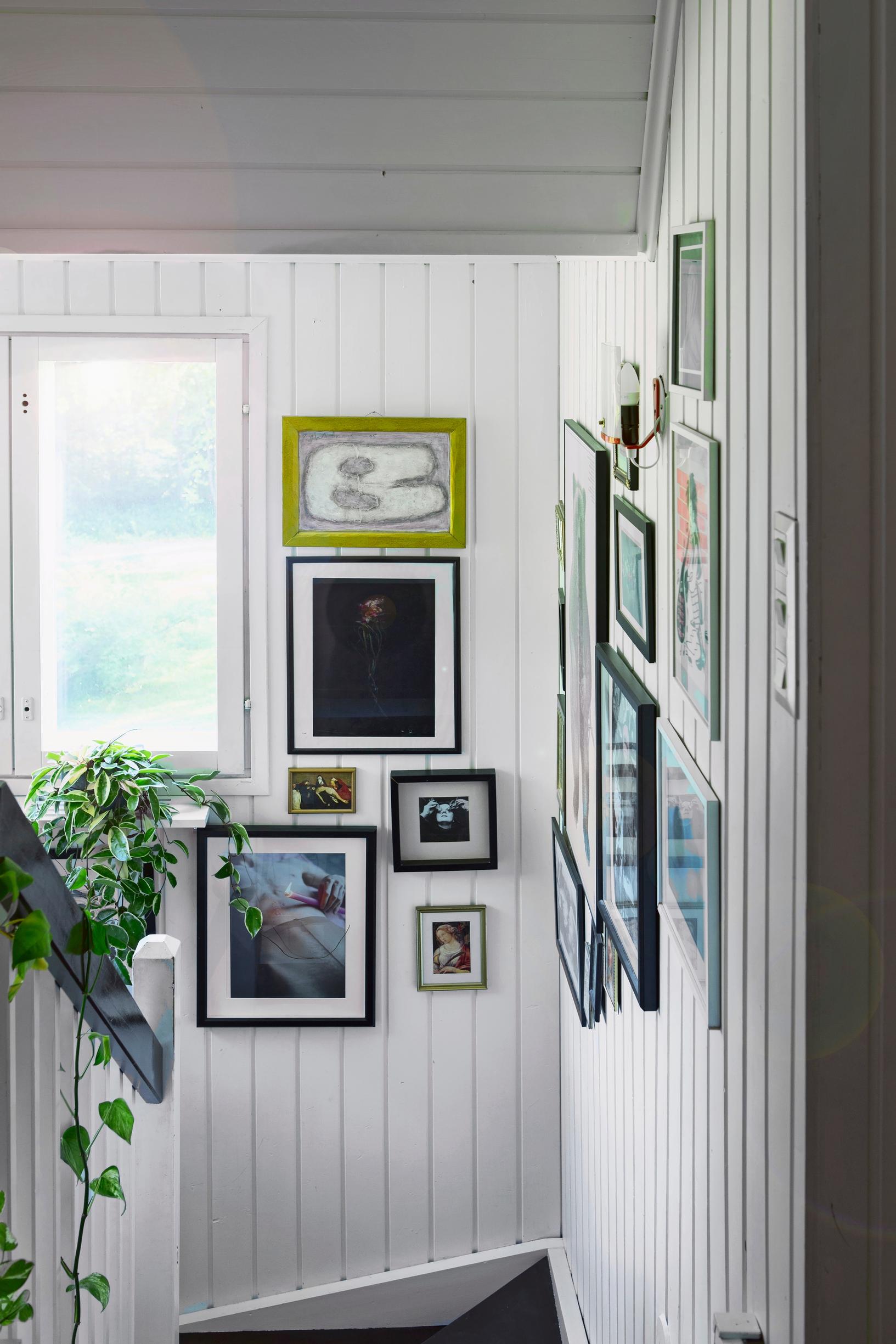 Portaikon seinillä on muun muassa matkoilta ja taidenäyttelyistä tuotuja kuvia ja Tiina Wallinin, Hanna Hyytiäisen, Ruth Moran ja Laurence Philomènen taidetta. Keltaisissa kehyksissä on Pertti Ohtosen tekemä maalaus.