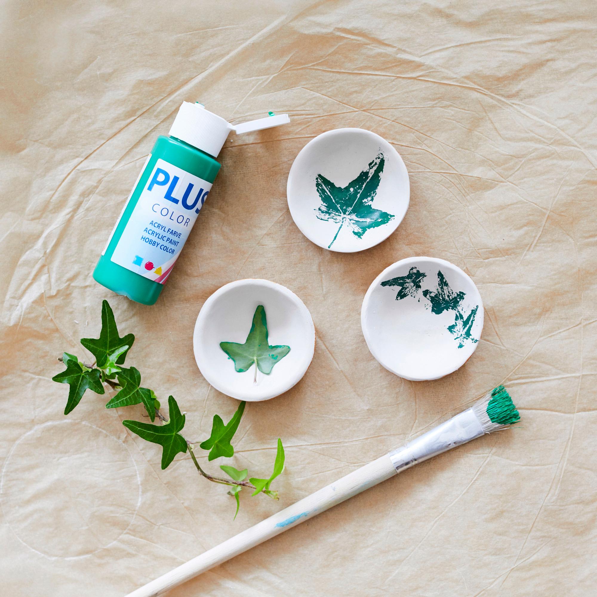 6. Kun kulhot ovat täysin kuivia, maalaa ulkopinnat askartelumaalilla. Paina sitten kulhojen sisäpintaan lehtikuvioita: sudi muratin tai muun viherkasvin lehti vihreällä askartelumaalilla ja paina jälki kulhoon. Jatka, kunnes kuvioita on tarpeeksi. Muratin ohella voit käyttää yrttien lehtiä ja oksia tai leikkokukkien lehtiä.