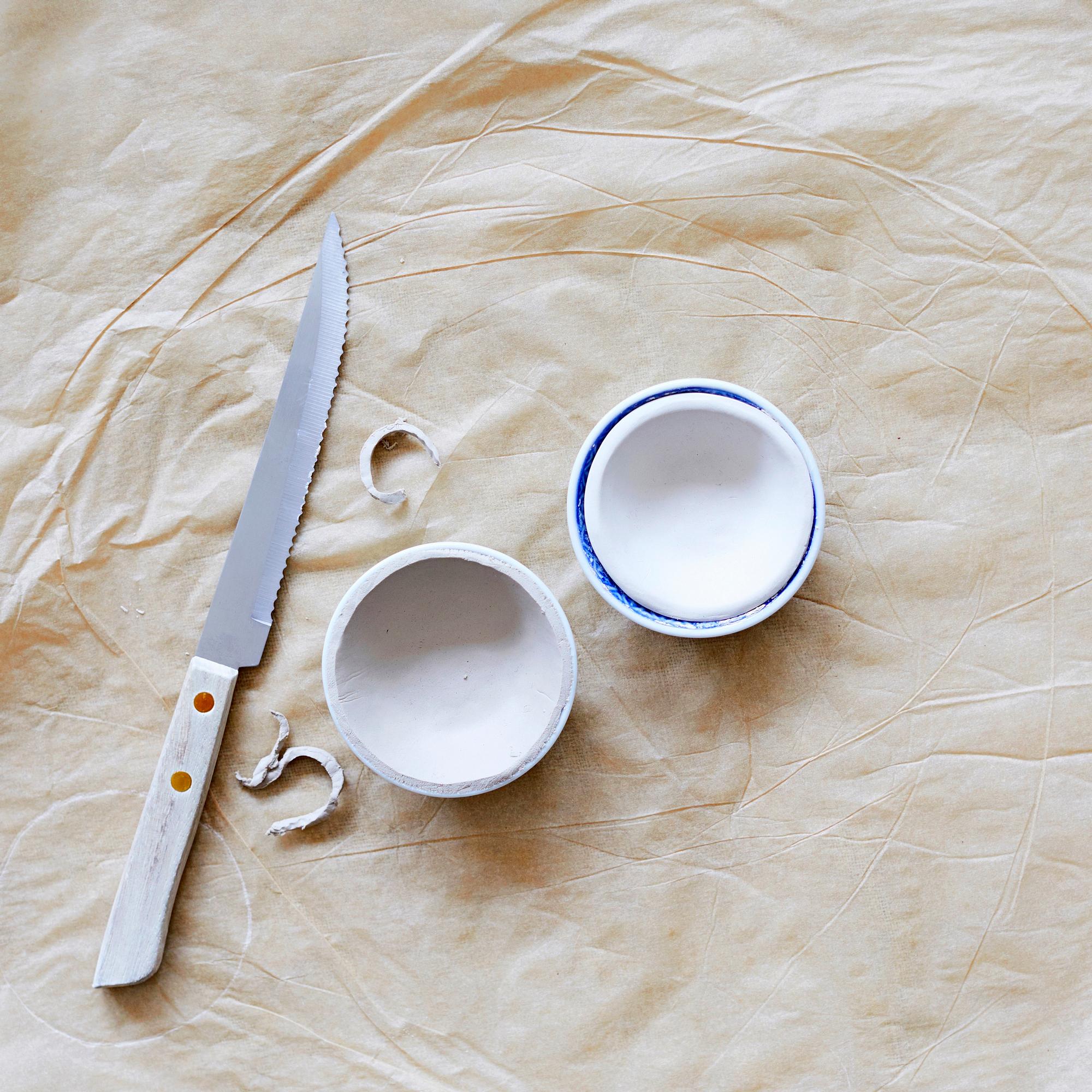 3. Painele savilätyt kevyesti kulhoihin. Tasoita reunat tarvittaessa veitsellä ja pehmennä leikkausjälki kevyesti sormella pyyhkäisten. Huomioi, että savi kutistuu kuivuessaan, joten muottien ulkopinnoille itsekovettuvaa savea ei voi muotoilla, etteivät kulhot halkea.