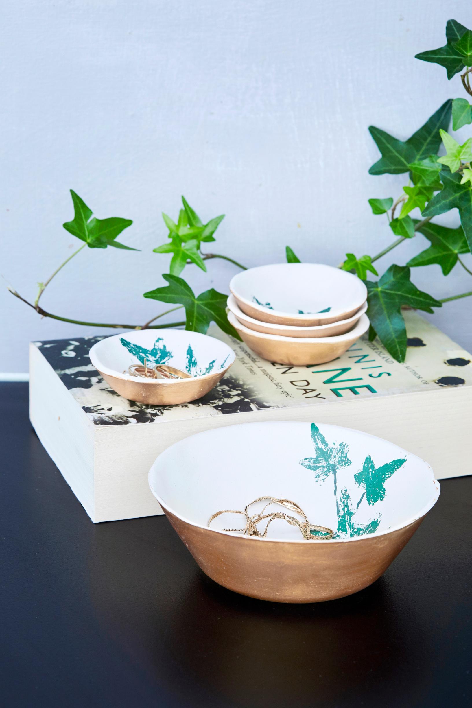Itsekovettuvasta savesta taiteilet helposti kauniita säilytysastioita. Käytä kippojen muotteina valmiita astioita ja paina koristekuviot viherkasvien lehdillä.