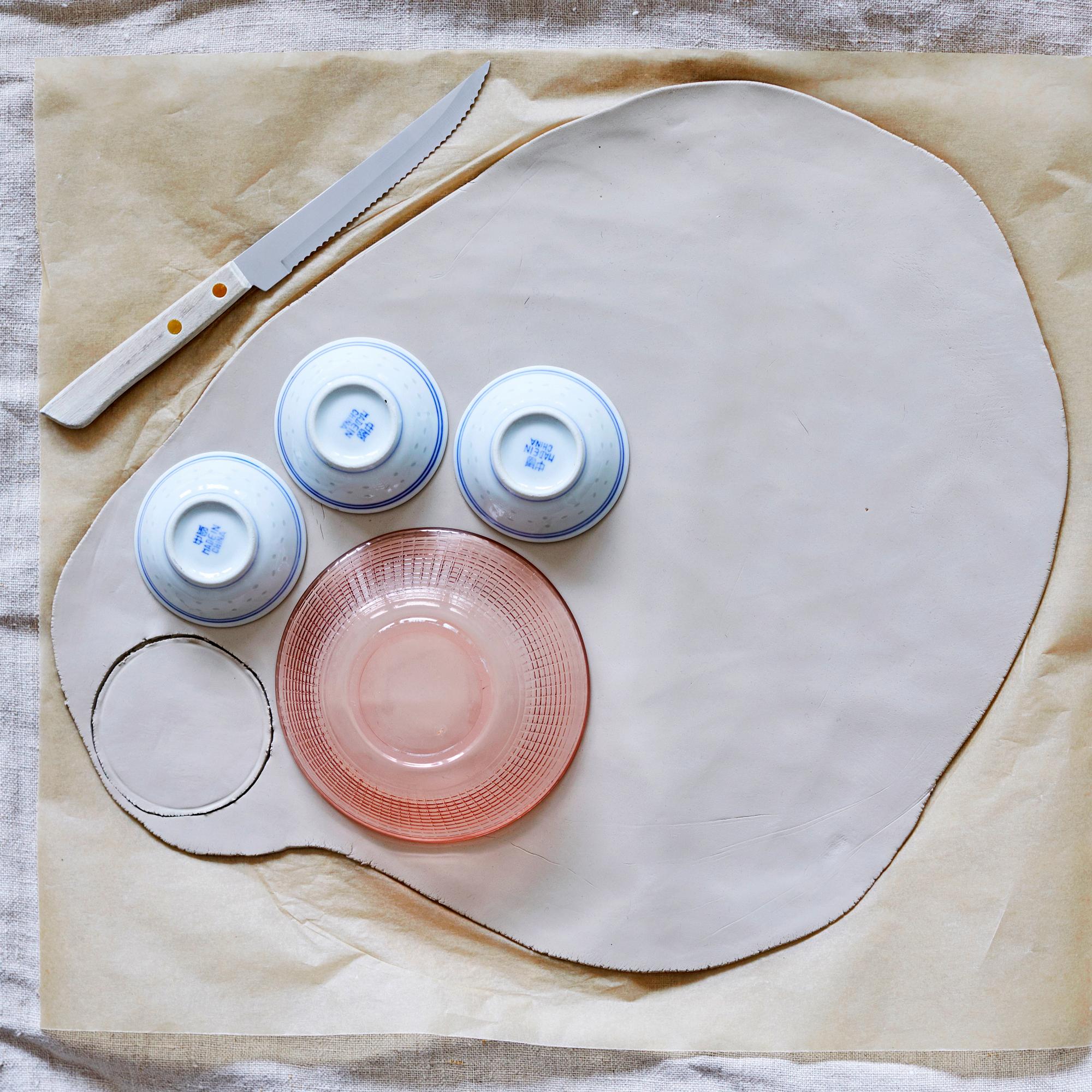2. Asettele muotteina käyttämäsi kulhot savilevylle suuaukko alaspäin vieri viereen. Leikkaa veitsellä levystä irti muottikulhojen kokoiset ympyrät ja nosta kulhot levyn päältä.