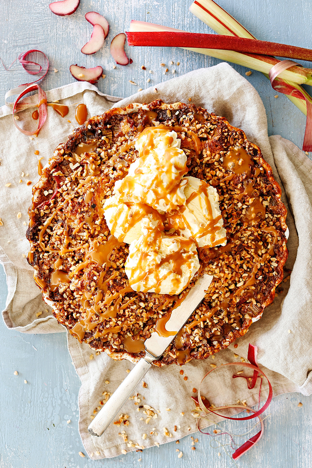 Paahdettua pähkinää, tahmeaa kinuskikastiketta ja vastapainona sopivan raikas raparperitäyte... Kyllä, pähkinäinen raparperi-kinuskipiirakka on varmasti jokaisen herkkusuun mieleen!