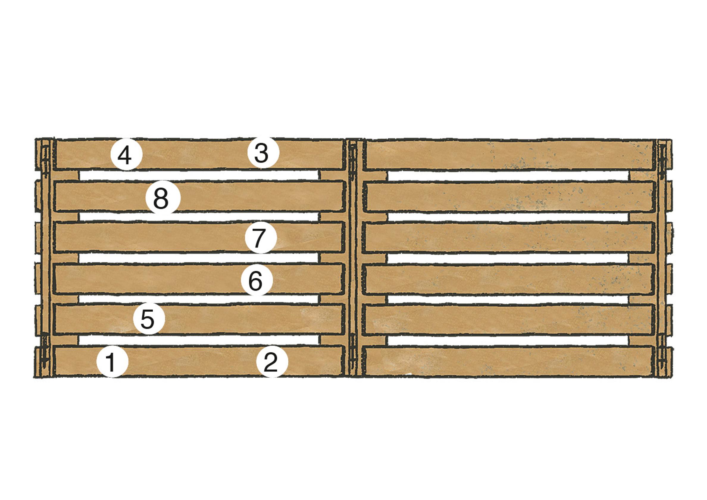 Kompostikehikko on mahdollista rakennella myös itse. Kaksiosainen kehikko muodostuu pitkästä takaosasta ja useammasta pienemmästä osasta. Katso ohjeet ja tee kompostikehikko itse!