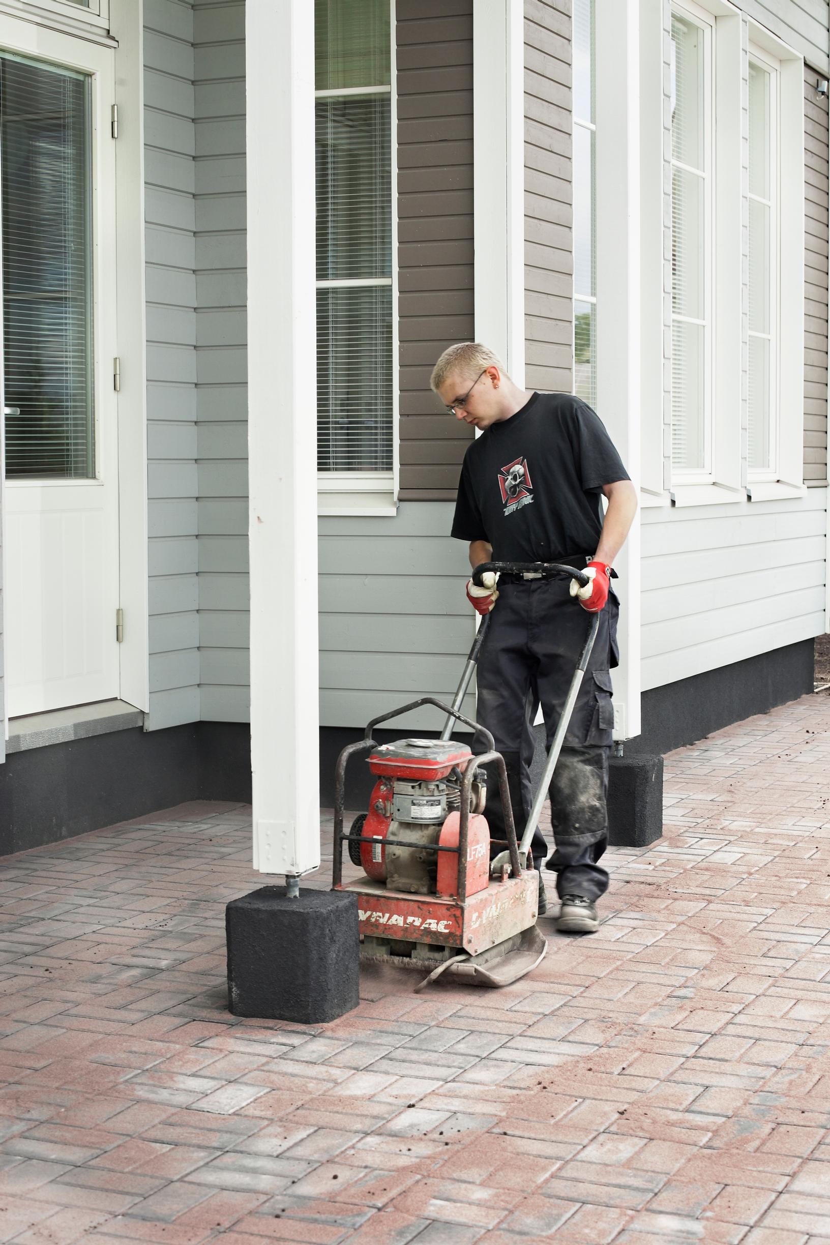 7. Tärytä kiveys hiekoituksen jälkeen alle sadan kilon painoisella tärylevyllä. Tarkista tämän jälkeen, onko saumoissa tarpeeksi hiekkaa. Lisää tarvittaessa hiekkaa ja harjaa se saumoihin.