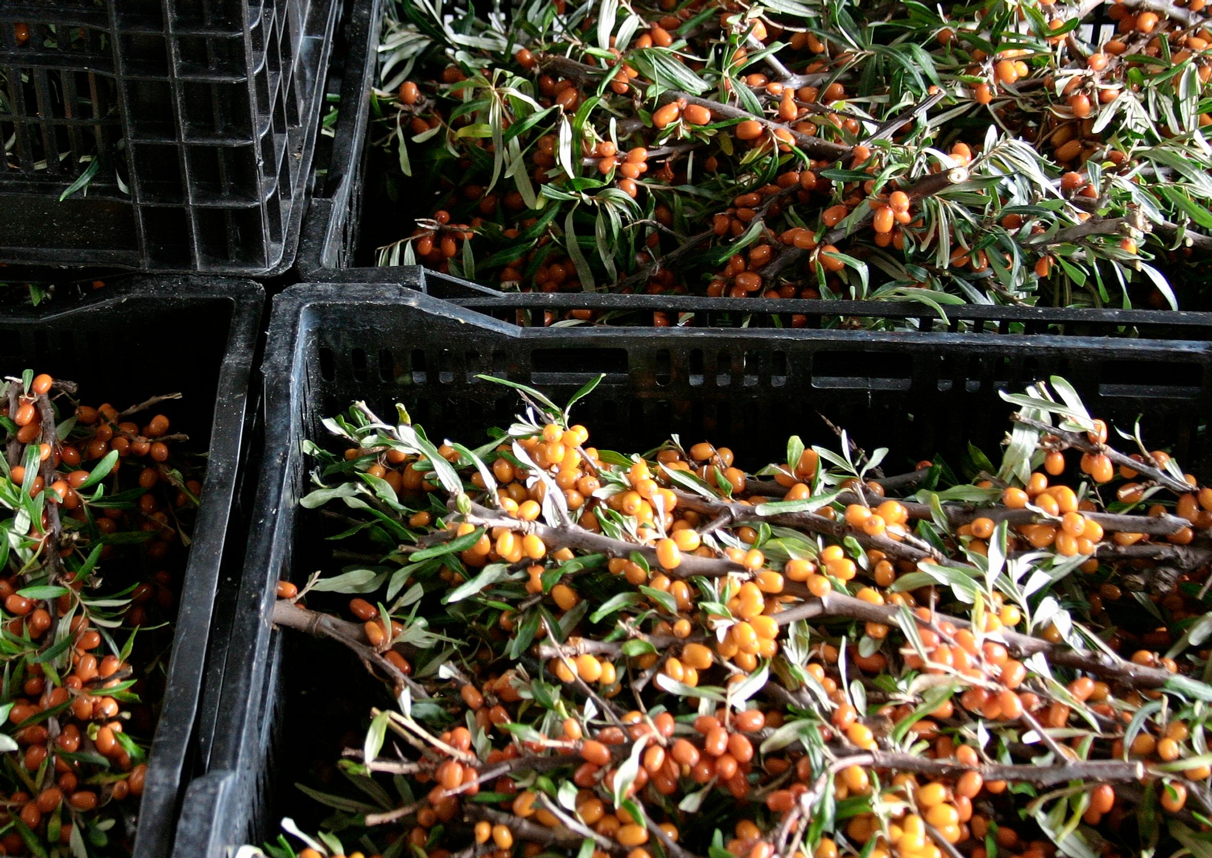 5. Kerää tyrnimarjat ennen niiden pehmenemistä. Jos pensaita on paljon, kokeile ammattiviljelijöiden korjuutapaa: leikkaa osa sato-oksista marjoineen ja jäädytä ne pakastusteholla. Jäiset marjat ja lehdet irtoavat oksista helisten. Seulo lehdet marjasseulalla ja kuivata ne käyttöä varten. Leikattu oksa tuottaa seuraavan kerran satoa 2–3 vuoden kuluttua. Korjuutapa soveltuu erityisen hyvin Tytti- ja Terhi-lajikkeille.