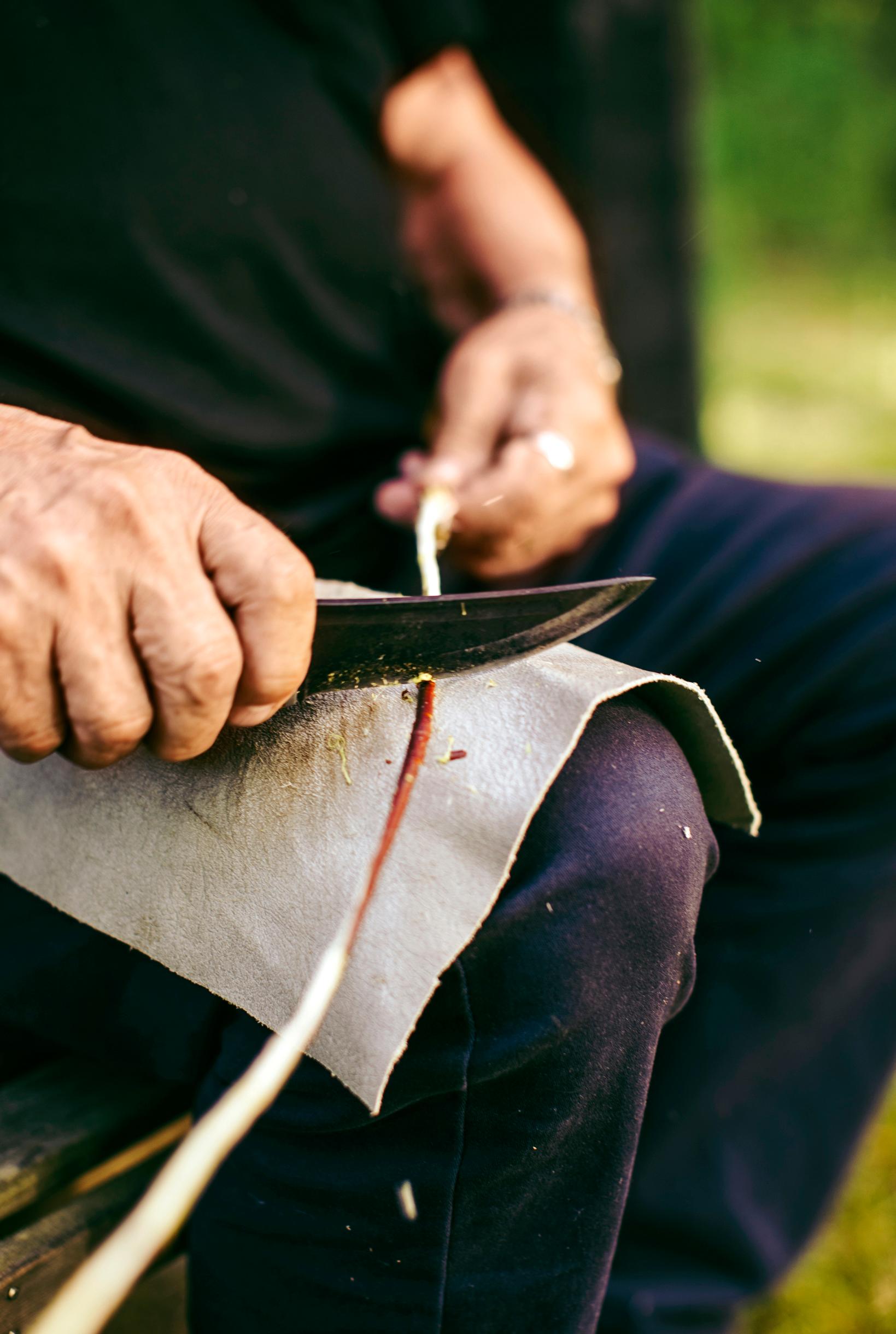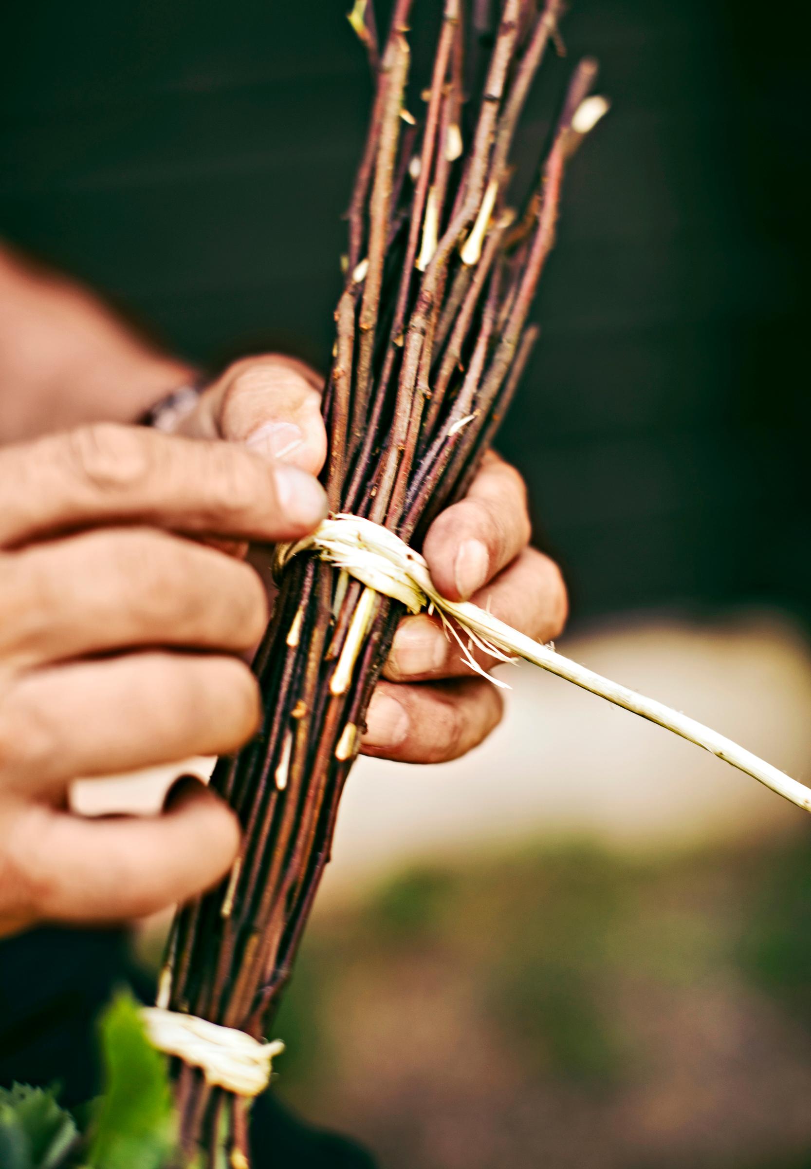 1. Valmista ensin sidevarpu. Ota varvusta oksat pois puukolla, vioittamatta varpua. Raaputa sidontavitsaksen kuori ennen vitsaksen kiertämistä molemmin puolin vetämällä vitsasta polven päällä puukon terän alla.