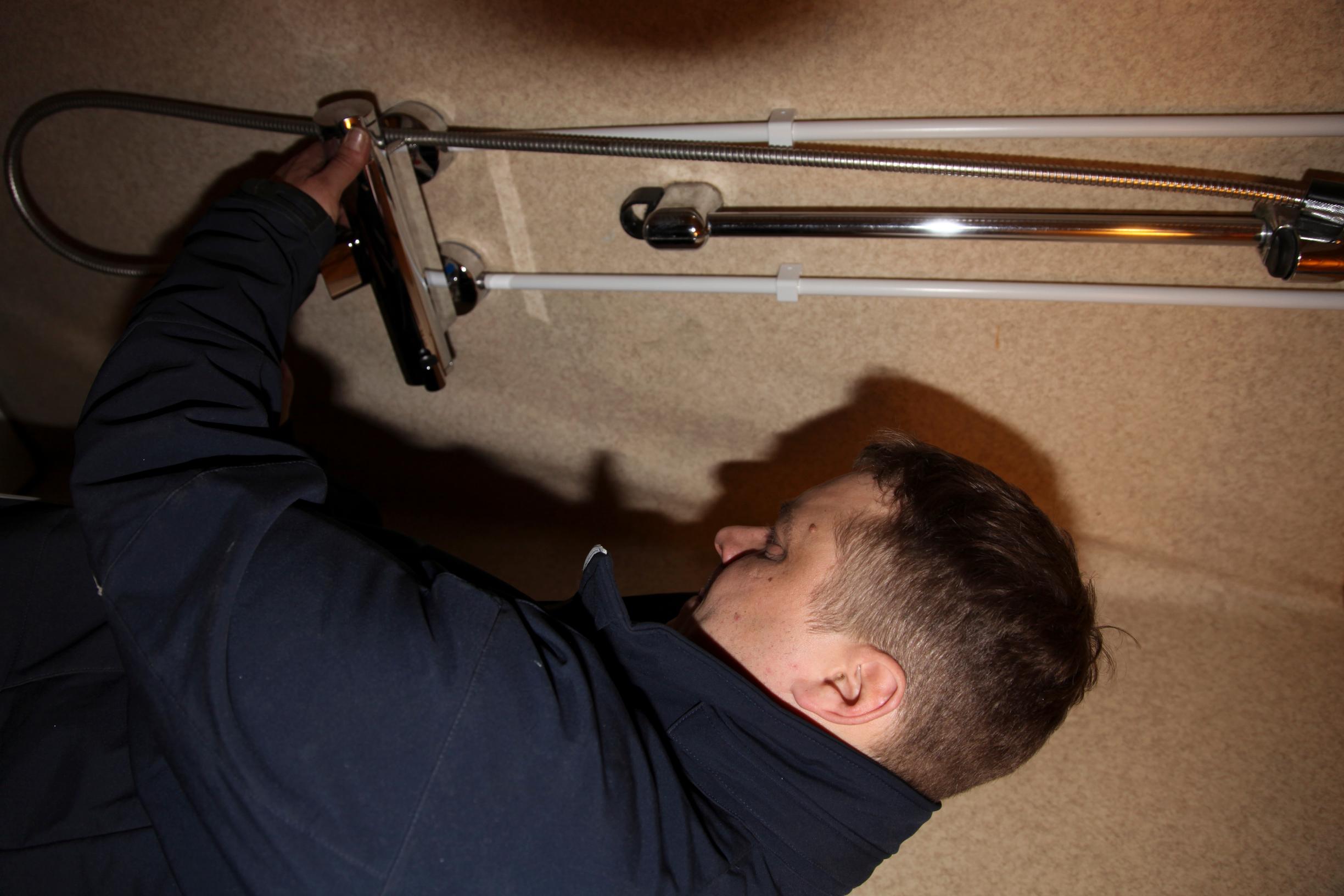 Lopuksi hän asensi uudet vesikalusteet, suihkusekoitushanan ja sekoitushanan.