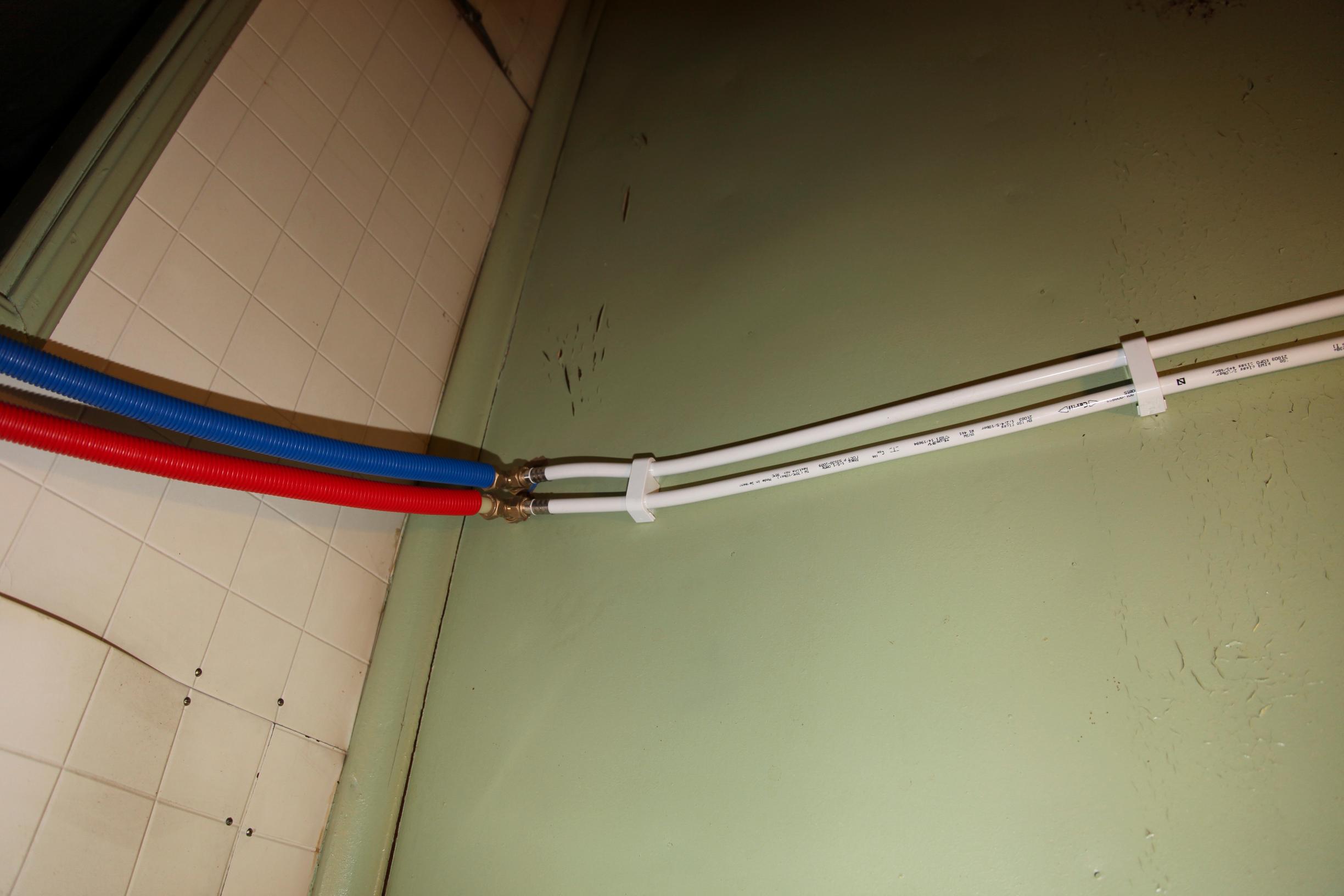 Jussi Leminen veti lämpimän veden runkoputkitukset kattilahuoneesta kellarin keskiosassa olevan noin 20-neliöisen harrastustilan kohdalle. Muovinen kylmävesiputki sinne jo tuli. Hän veti lämmin- ja kylmävesirunkoputket saunan seinän taakse ja sieltä ensimmäisen kerroksen keittiöön.