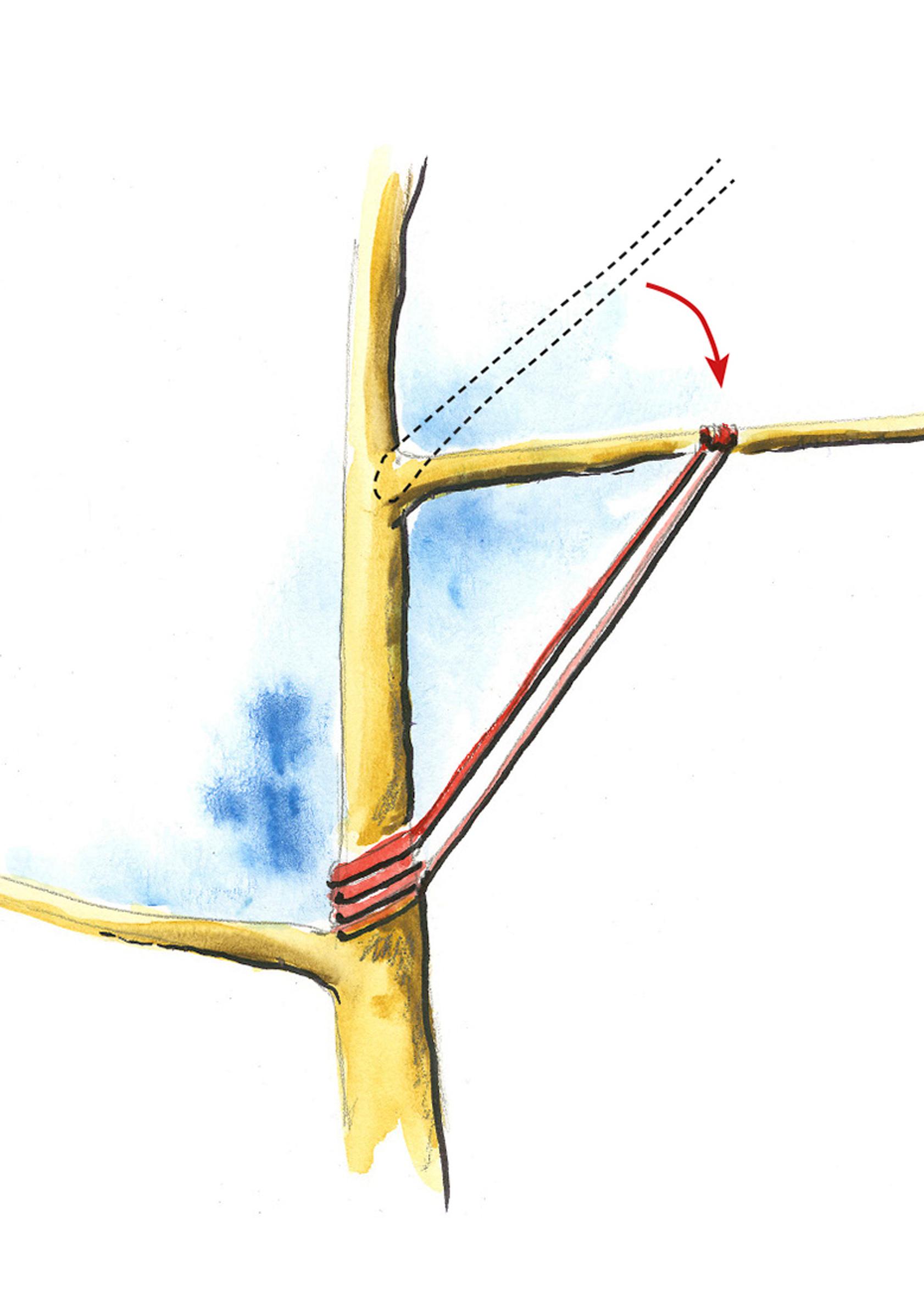 Omenapuun oksat vaativat myös taivuttamista. Vaakatasoon taivutettu oksa saa valoa koko pituudeltaan, lopettaa pituuskasvunsa ja alkaa muodostaa kukkasilmuja.