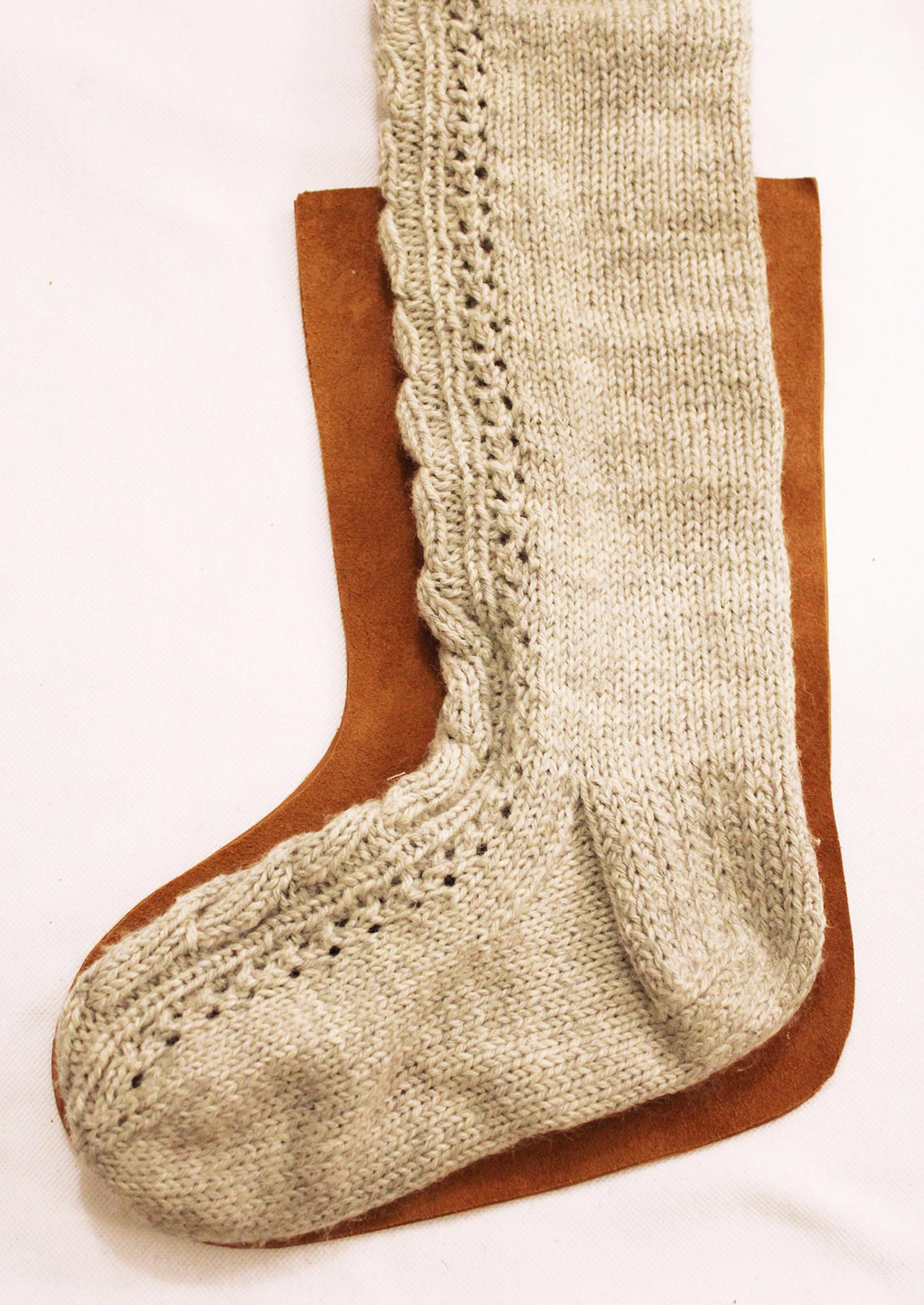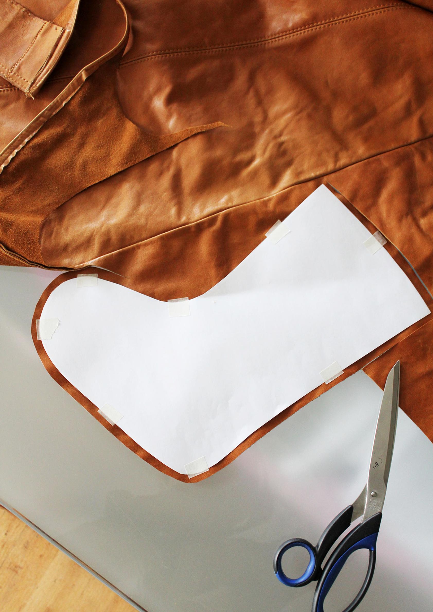 2. Leikkaa nahasta kaksi kappaletta yhtä joulusukkaasukkaa varten. Muista pienet saumanvarat.