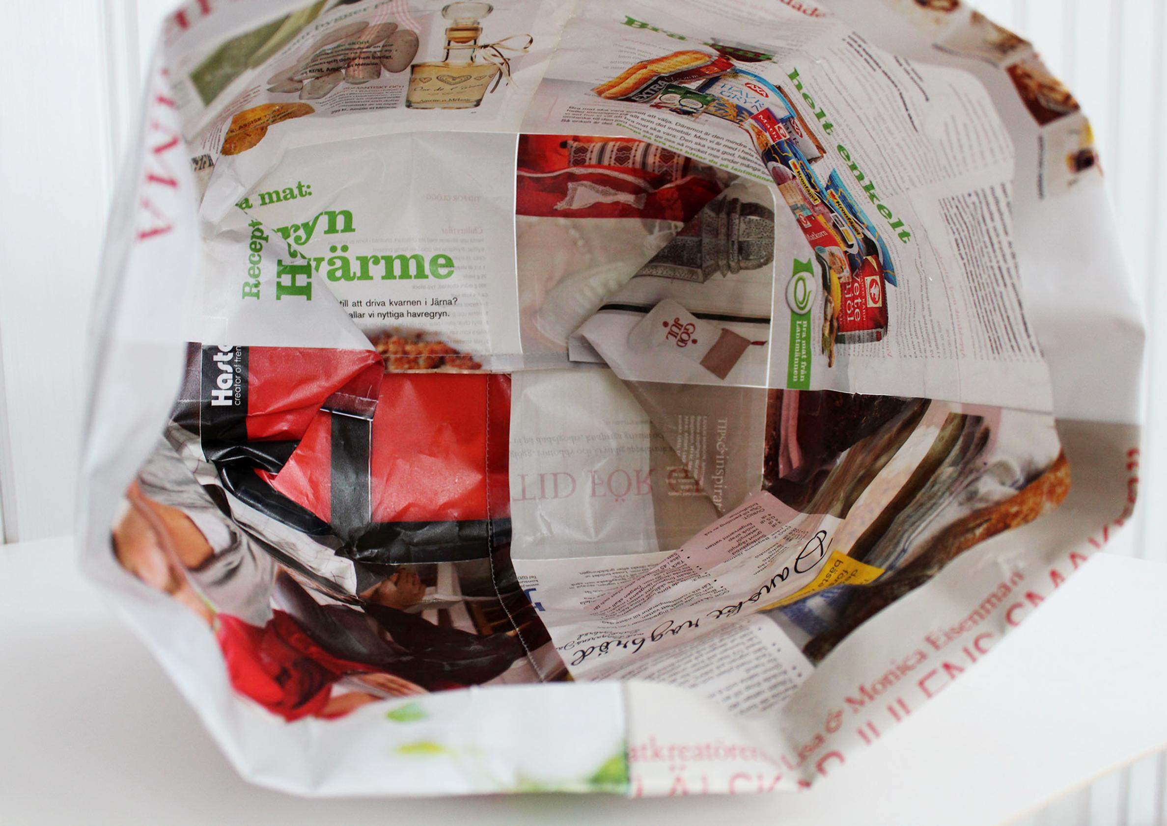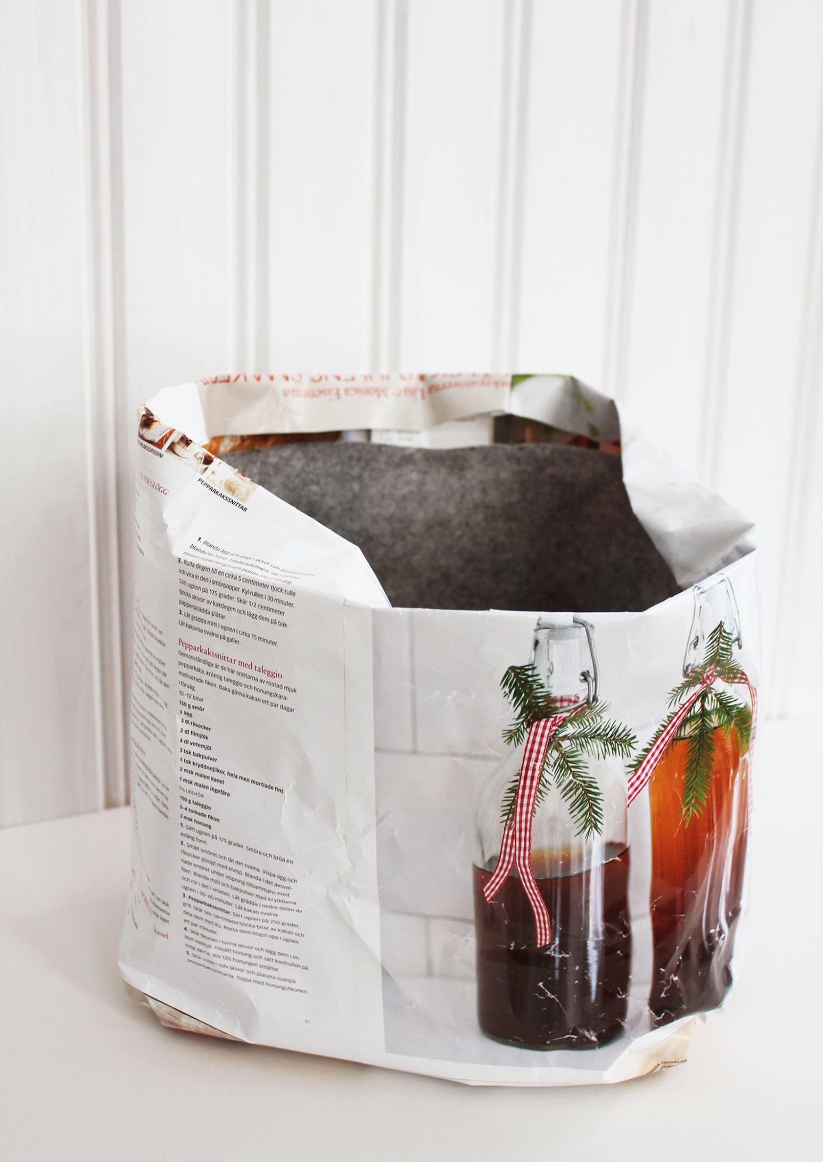 8. Asettele pussit sisäkkäin ja taittele paperireunat sisäpuolelle. Täytä lopuksi joulukori jouluisilla herkuilla.