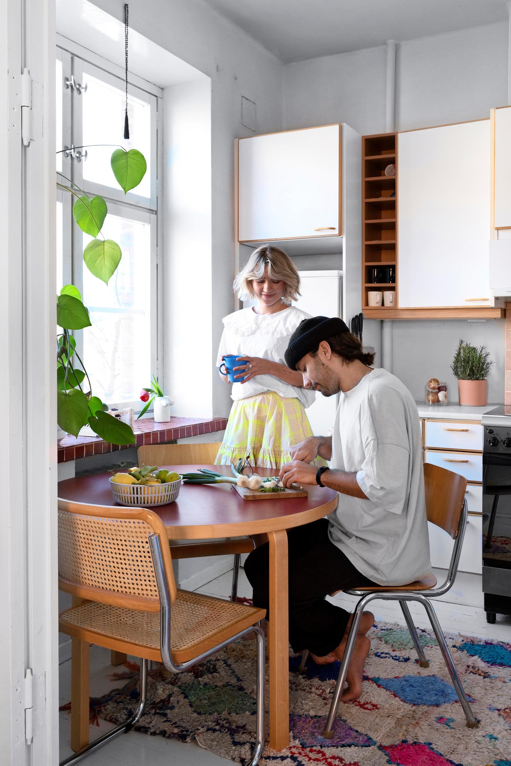 Kodikas ysärikeittiö ja olohuoneessa entinen saarnapöytä – Oona ja Kalle ovat hankkineet kaksioonsa lähes kaiken käytettynä