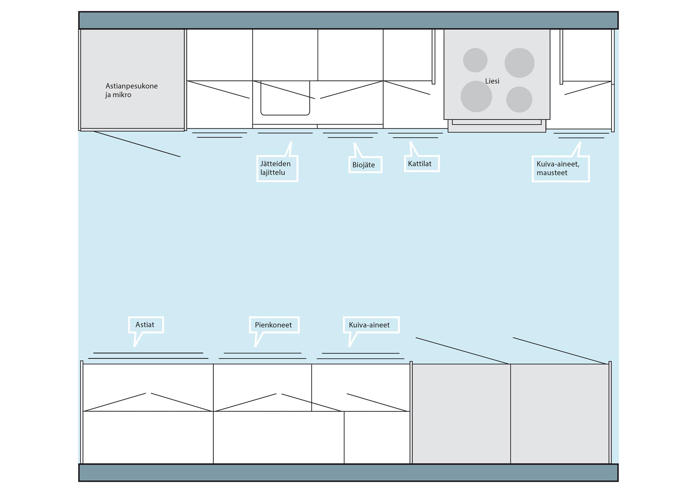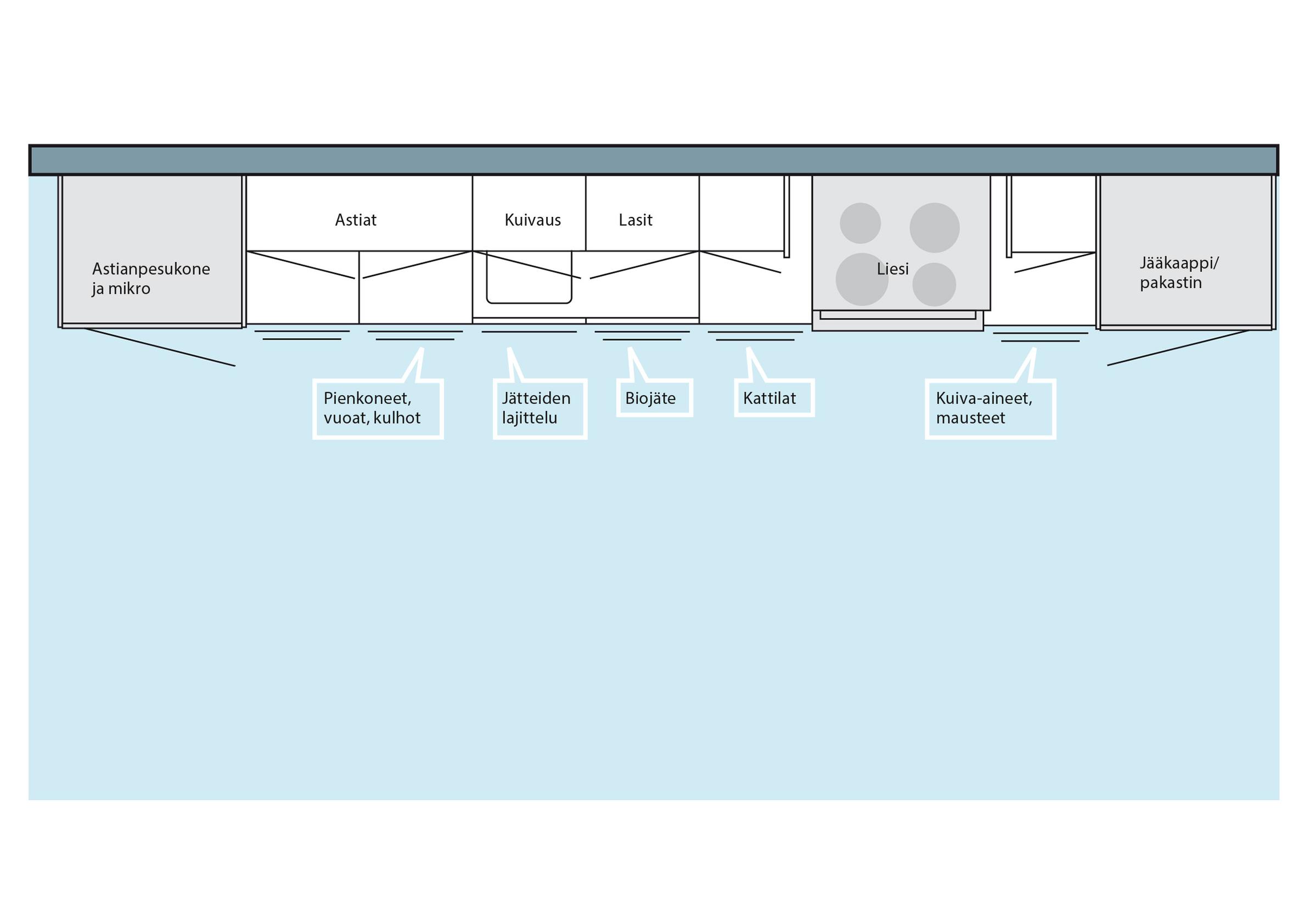 - Tasojen sijoittelulla on merkitystä. Tilaa kannattaa varata tarpeeksi niin työskentelyyn kuin laskutasoiksi.