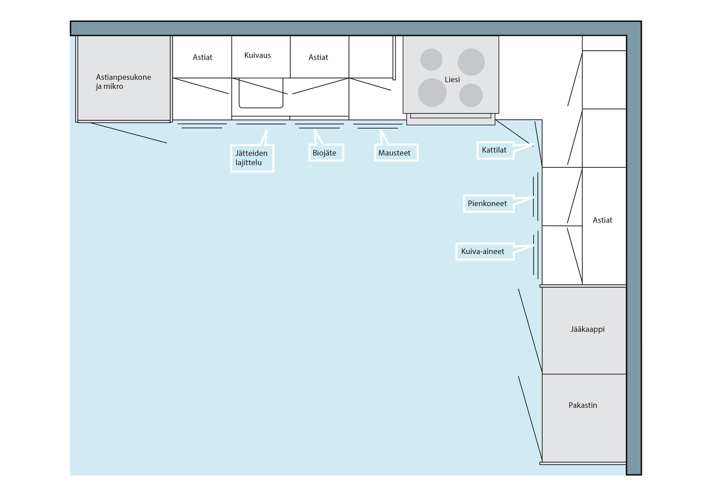 - L-keittiö syntyy sijoittamalla koneet ja kalusteet kahdelle vierekkäiselle seinälle.